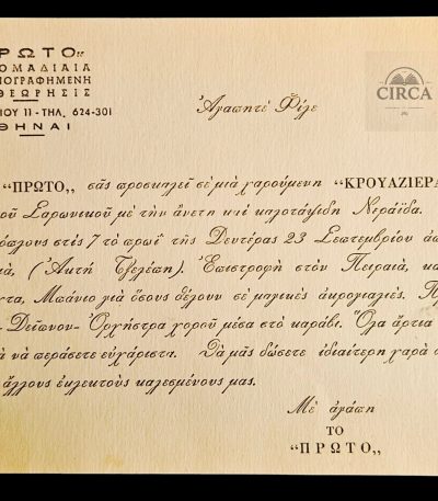 €18.00Original Greek printed travel / leisure ephemera, issued by the illustrated weekly magazine “PROTO” (ΠΡΩΤΟ), inviting the recipient to a one-day organized cruise to the Saronic Gulf islands.
