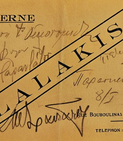 Printed in French, the card reflects the cosmopolitan atmosphere of interwar Athens and promotes the venue as an “ultra-modern tavern” featuring live music by the renowned Gypsy orchestra of “Notis”, a popular form of violin-led entertainment among the city’s social elite.