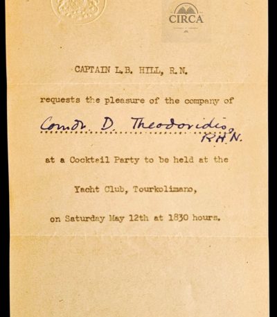 Original official British Royal Navy social invitation, issued by a Royal Navy Captain, inviting a senior naval officer to a cocktail reception at the Yacht Club, Tourkolimano (Piraeus, Greece).
