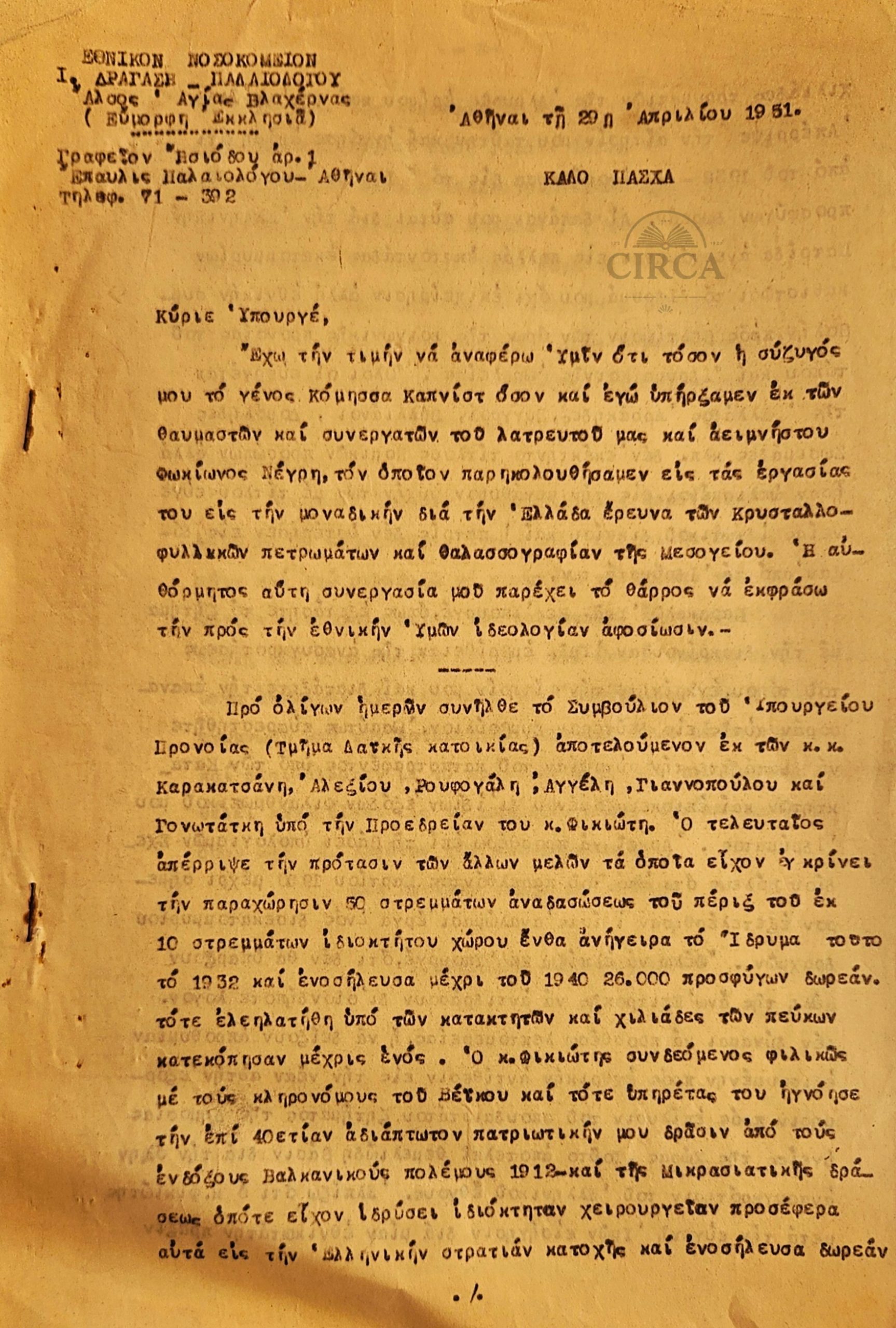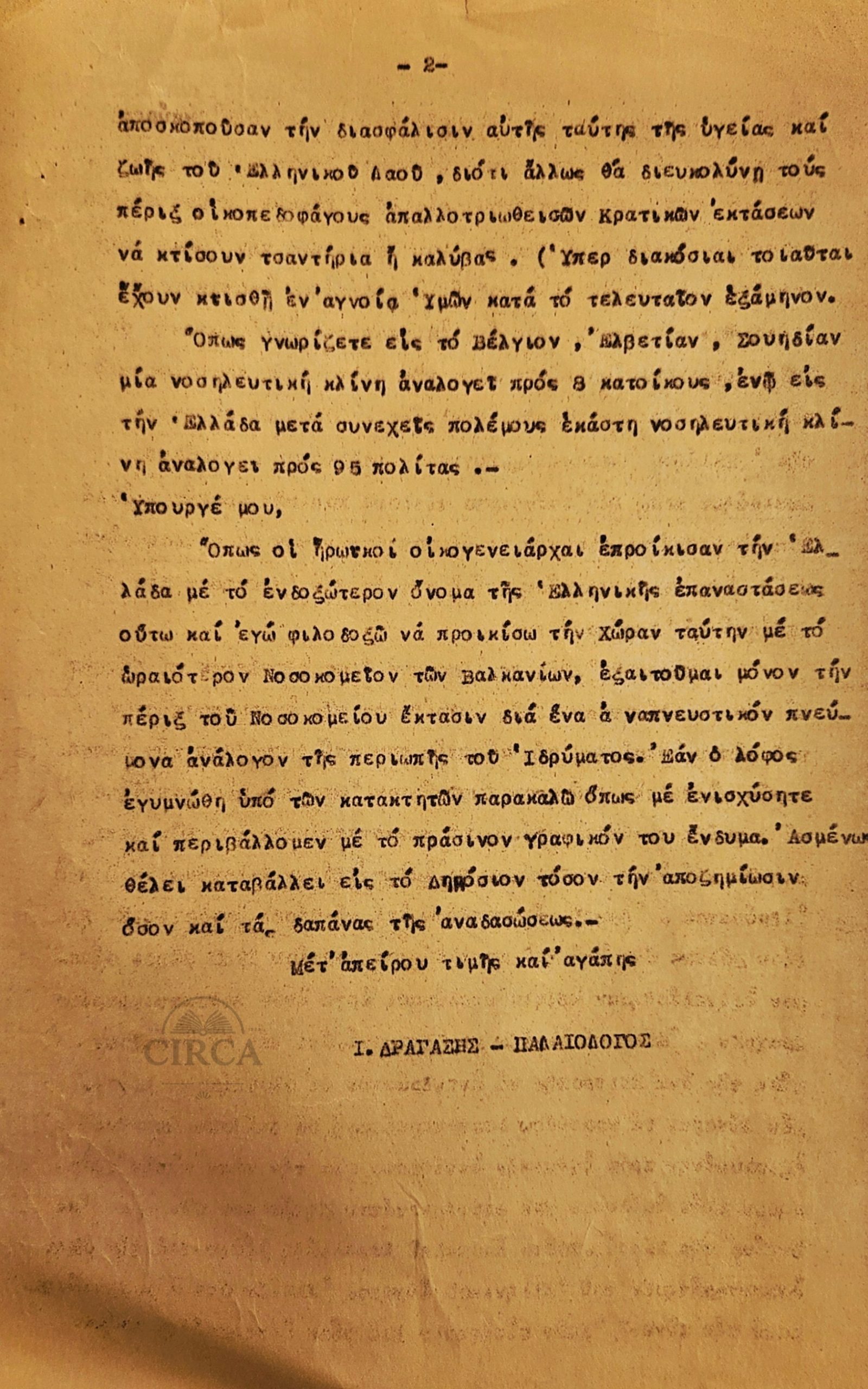 Σπάνιο σύνολο που περιλαμβάνει μια διαφημιστική αφίσα και δακτυλογραφημένες επιστολές (1951) του Ι. Δραγάτση – Παλαιολόγου, ιδρυτή και ευεργέτη του Εθνικού Νοσοκομείου Αθηνών.
