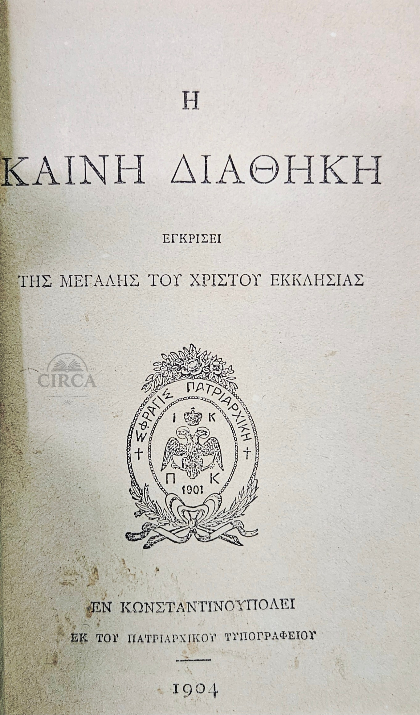 Πατριαρχική έκδοση της Καινής Διαθήκης, εγκεκριμένη από τη Μεγάλη του Χριστού Εκκλησία και τυπωμένη στο Πατριαρχικό Τυπογραφείο της Κωνσταντινούπολης το 1904.
