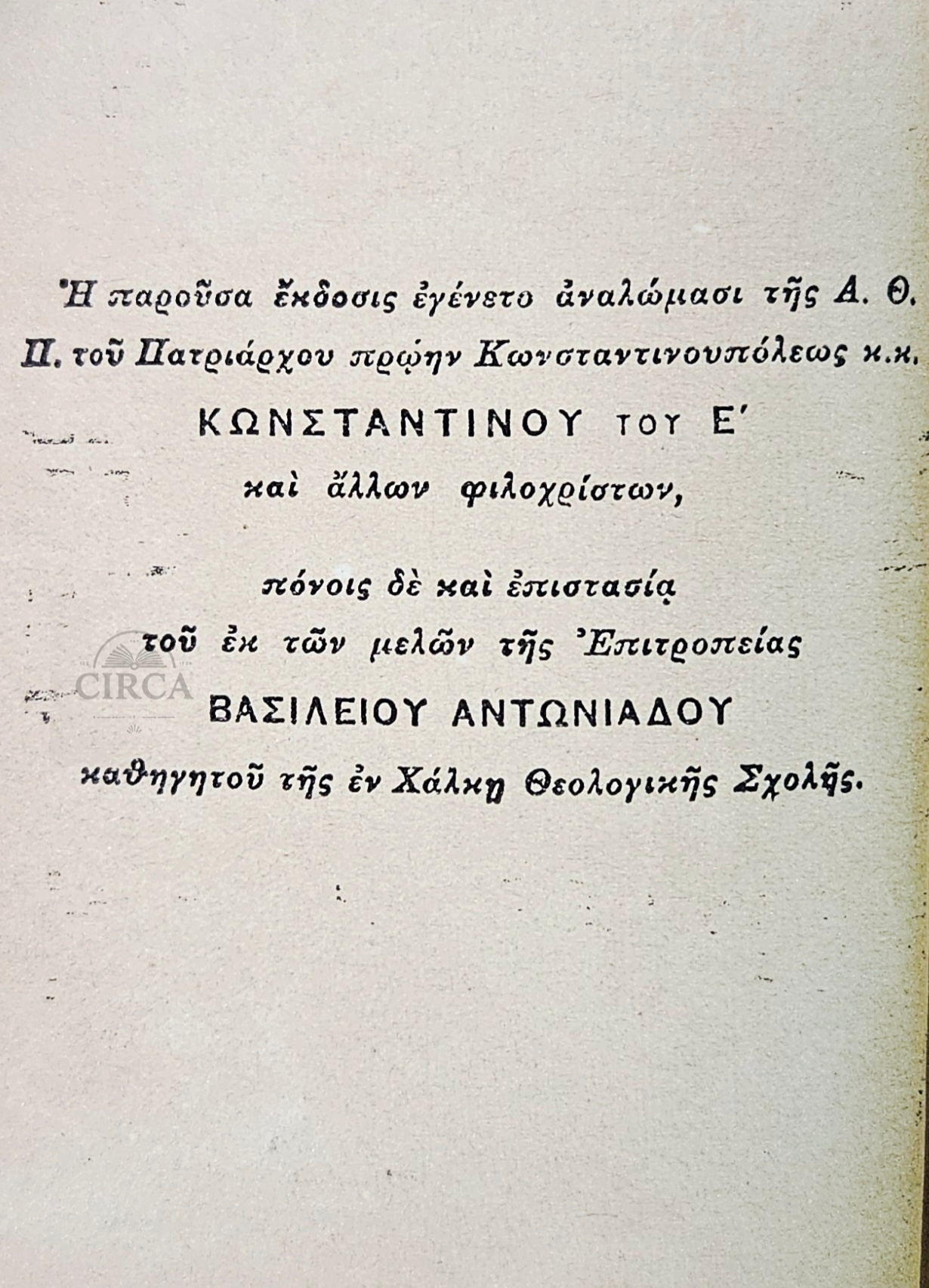 Η έκδοση πραγματοποιήθηκε με τη δαπάνη του πρώην Πατριάρχου Κωνσταντινουπόλεως Κωνσταντίνου Ε΄ και υπό την επίβλεψη του καθηγητή της Θεολογικής Σχολής Χάλκης Βασιλείου Αντωνιάδου.
