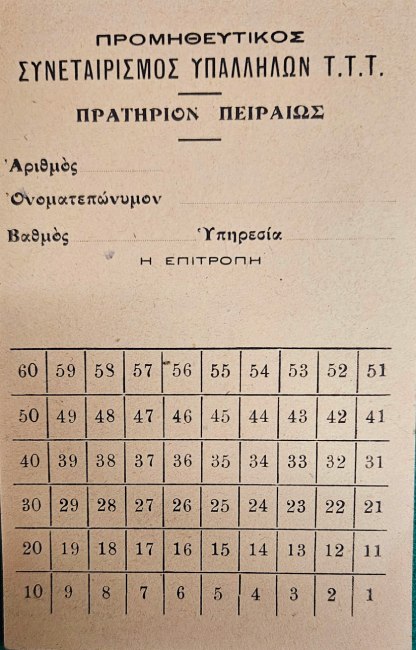 Αυθεντικό δελτίο προμηθειών από τον Προμηθευτικό Συνεταιρισμό Υπαλλήλων Τ.Τ.Τ., Πειραιά, δεκαετίας 1950. Χρησιμοποιούνταν για την καταγραφή αγορών/παροχών στους υπαλλήλους των Ταχυδρομείων, Τηλεγραφείων και Τηλεφώνων. Καθαρή κατάσταση, με αριθμημένο πίνακα (1–60) και επικεφαλίδα της Επιτροπής.