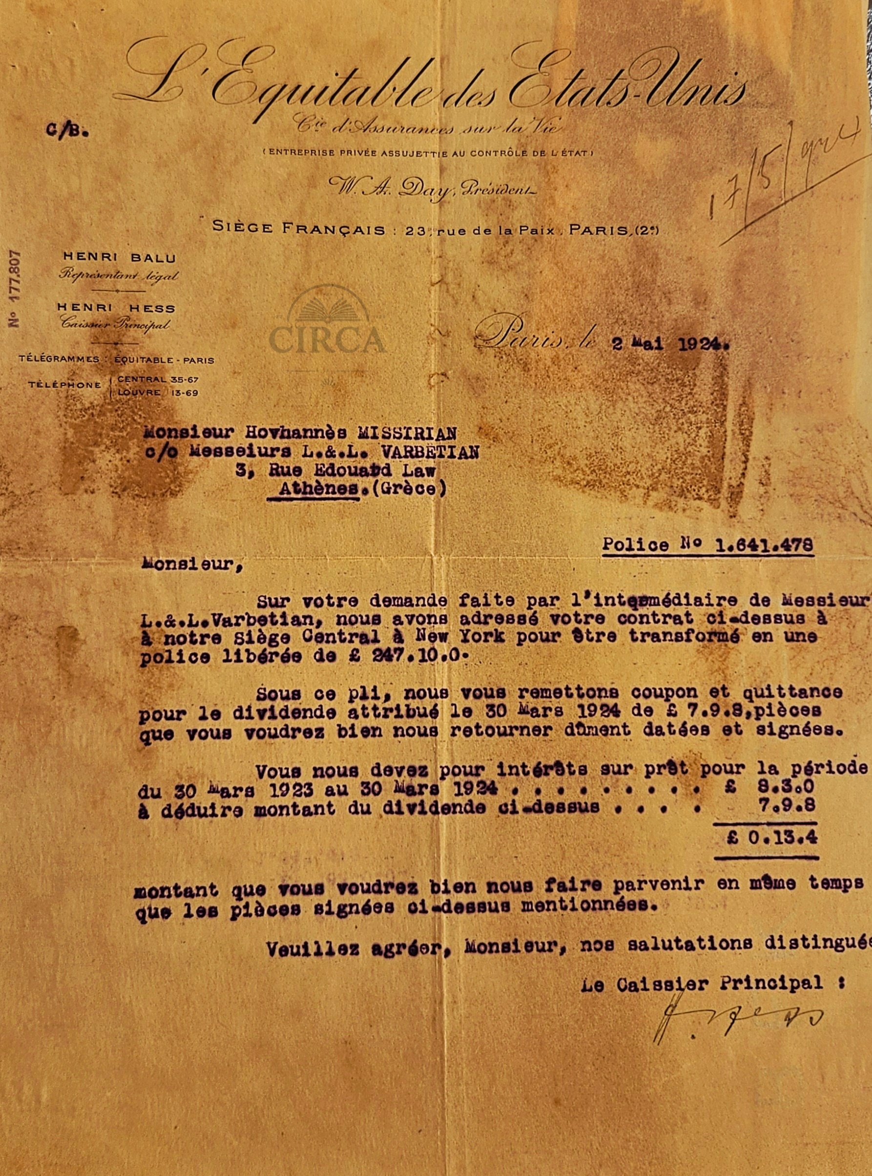 The letter is addressed to Hovhannès Missirian, via the Armenian commercial firm L. & L. Varbetian (3 Rue Edouard Law, Athens, Greece). It concerns the conversion of a life insurance contract, dividend allocation, interest deductions, and related accounting details, reflecting standard international insurance and financial practices of the early 20th century.