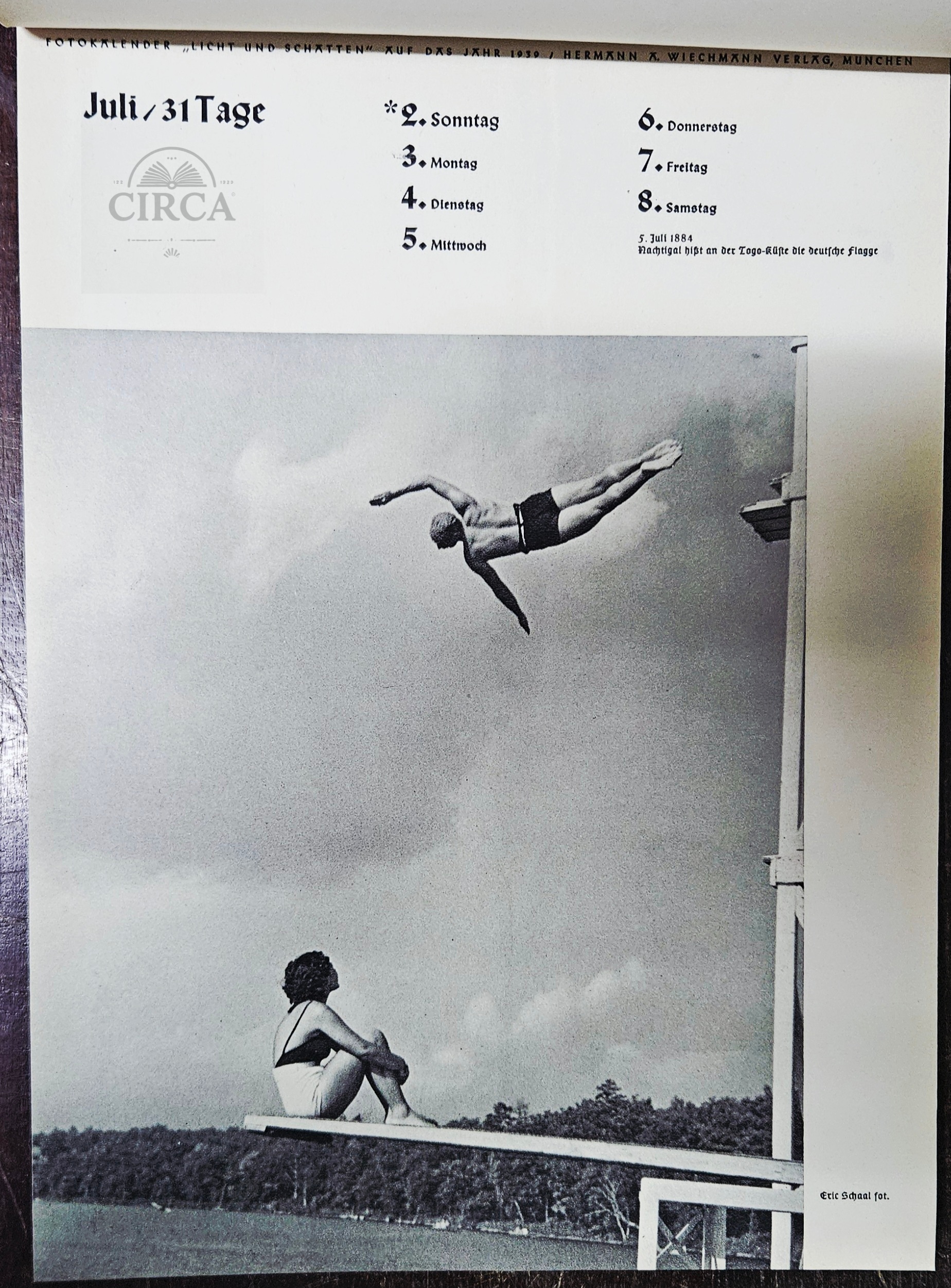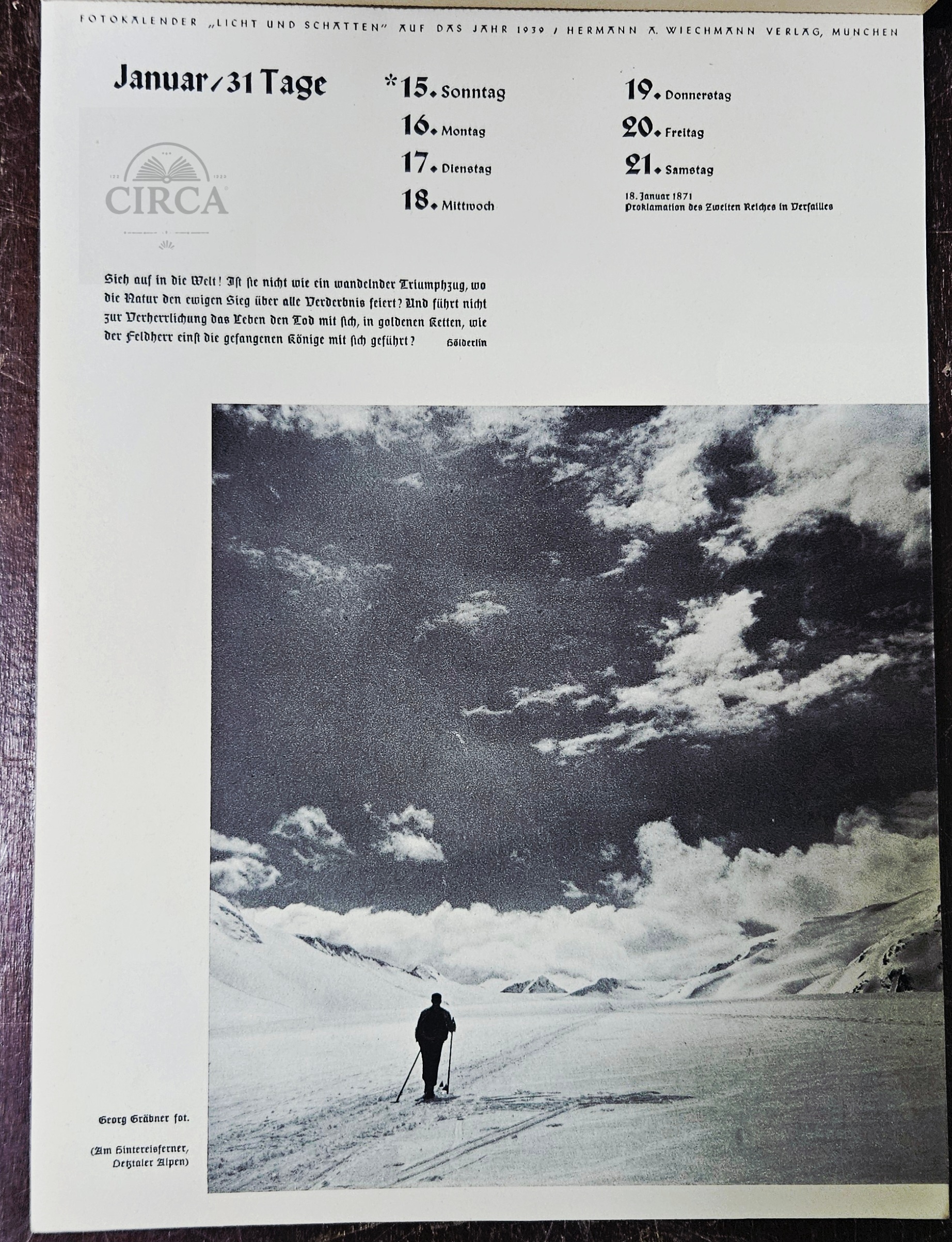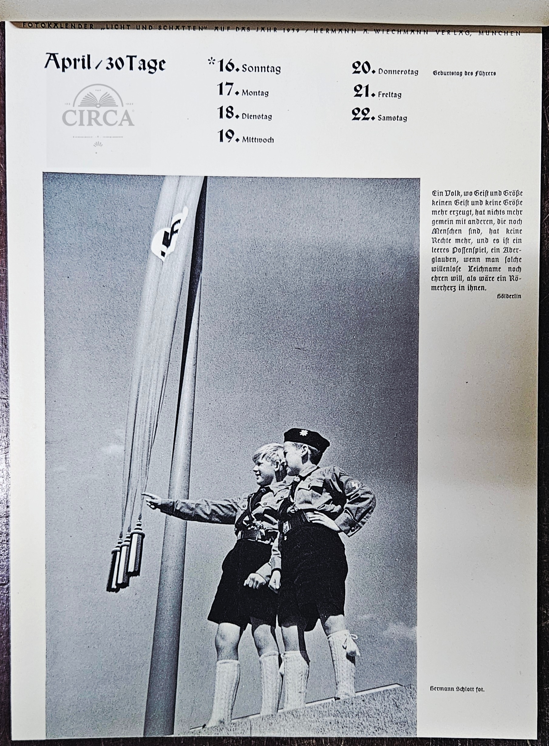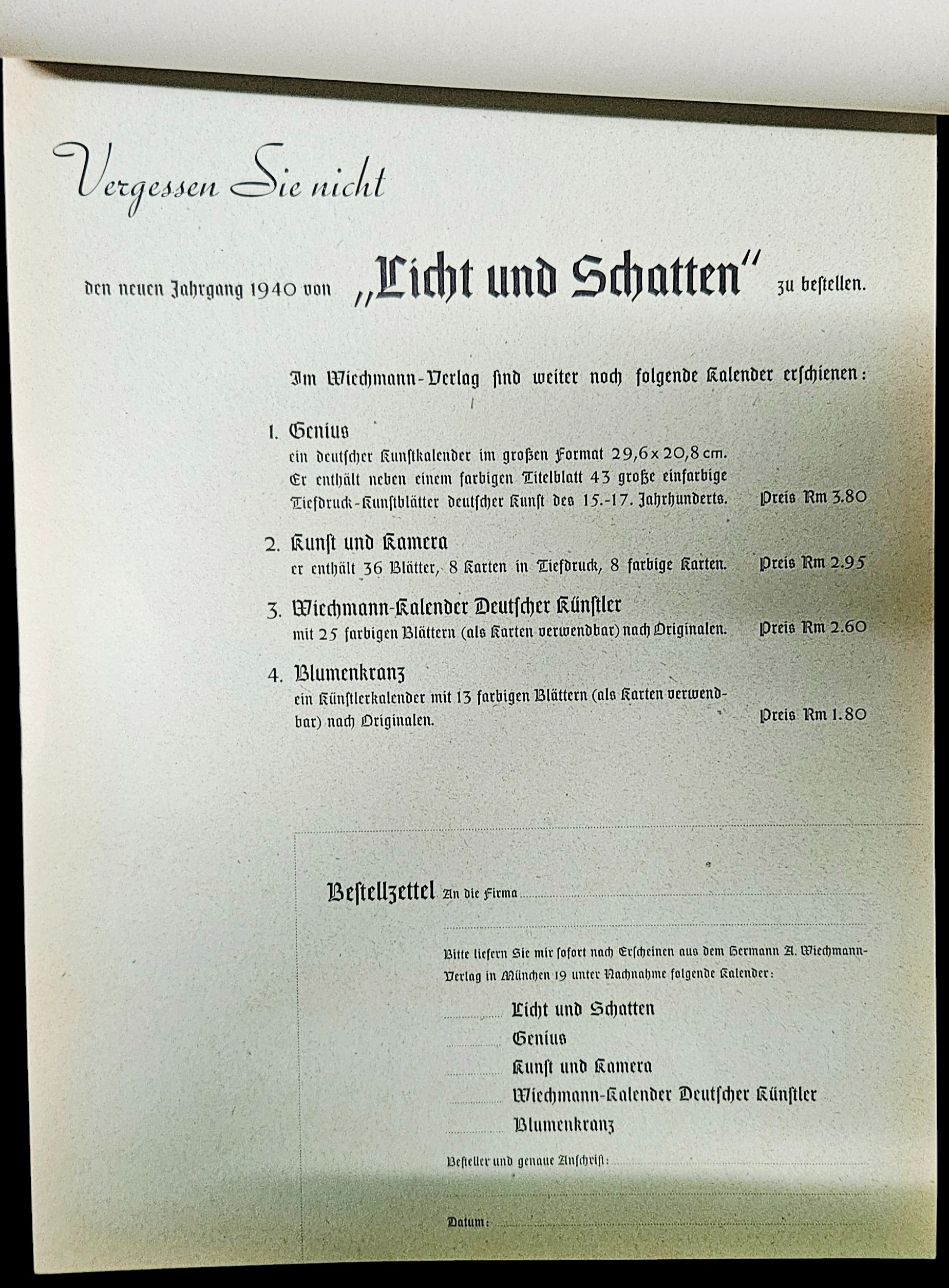 Original 1939 German photographic wall calendar titled Licht und Schatten (“Light and Shadow”), published by Hermann A. Wiechmann Verlag, Munich.