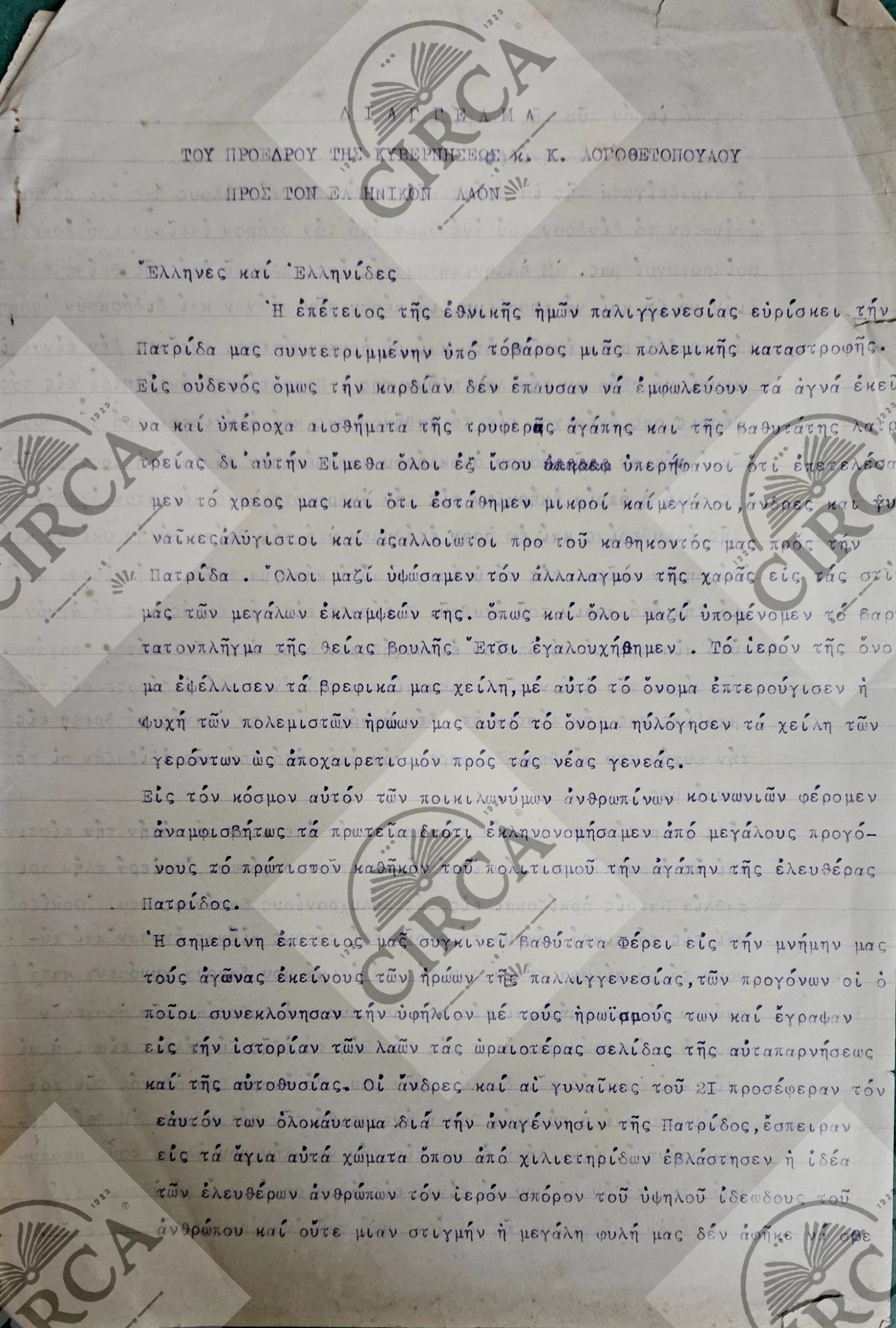 Αυθεντικό δακτυλογραφημένο έγγραφο του 1942, που περιέχει λόγο του Κωνσταντίνου Λογοθετόπουλου, Πρωθυπουργού της Ελλάδας κατά τη διάρκεια της Γερμανικής Κατοχής.