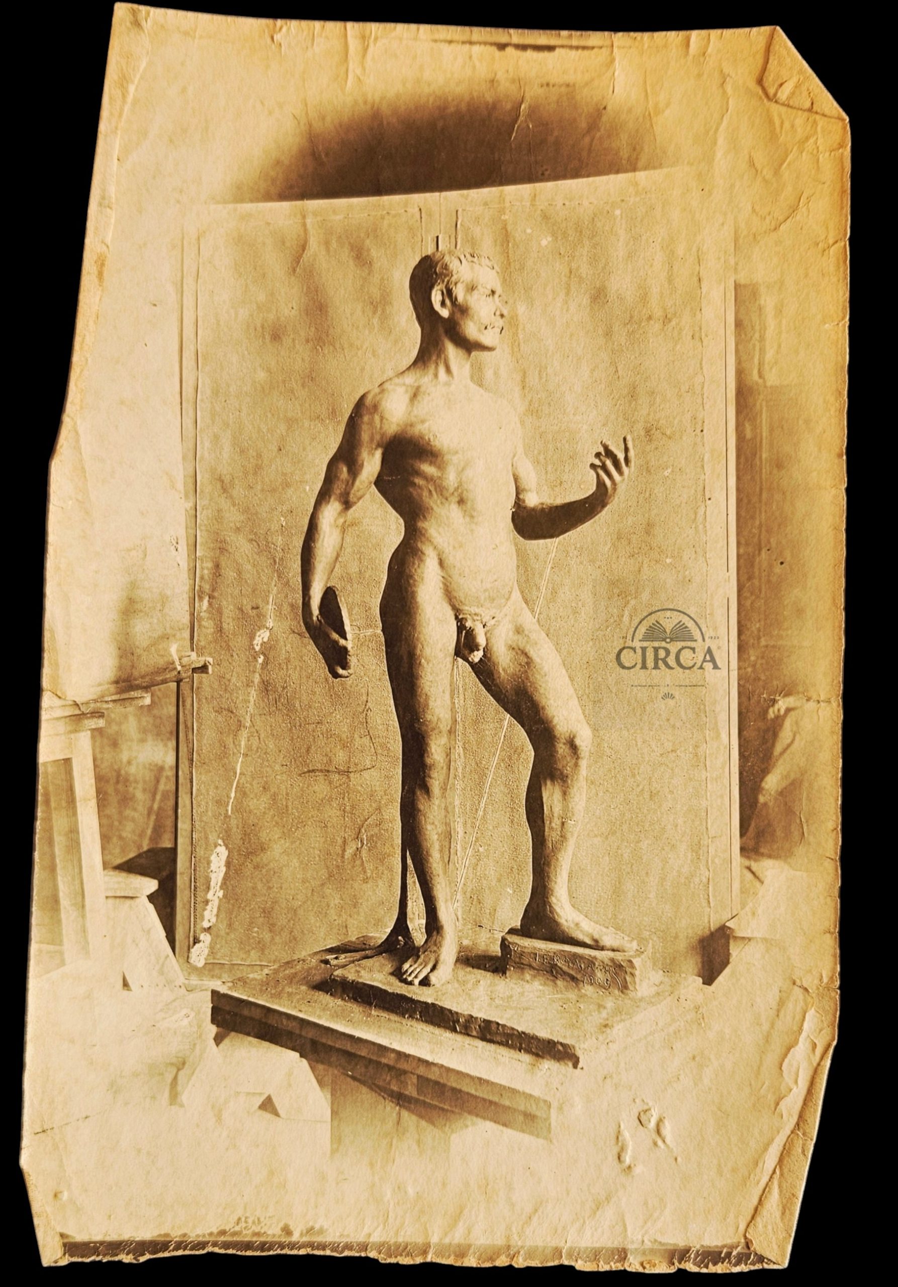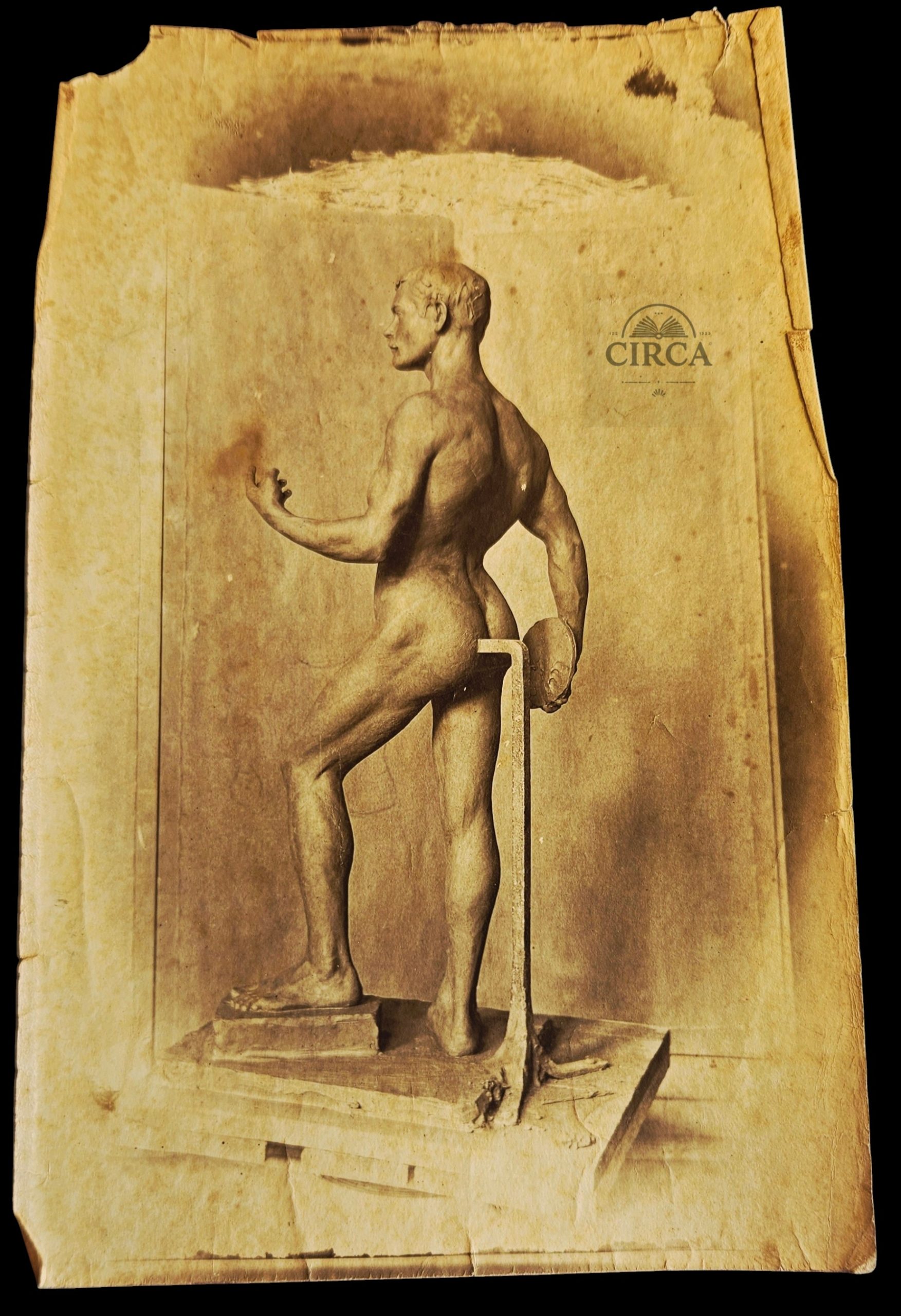 Both photographs depict the same academic plaster sculpture of a nude male athlete holding a discus, shown from two different views. These images were produced for artistic and anatomical study and were actively used in fine art academies, which explains the heavy wear visible today.