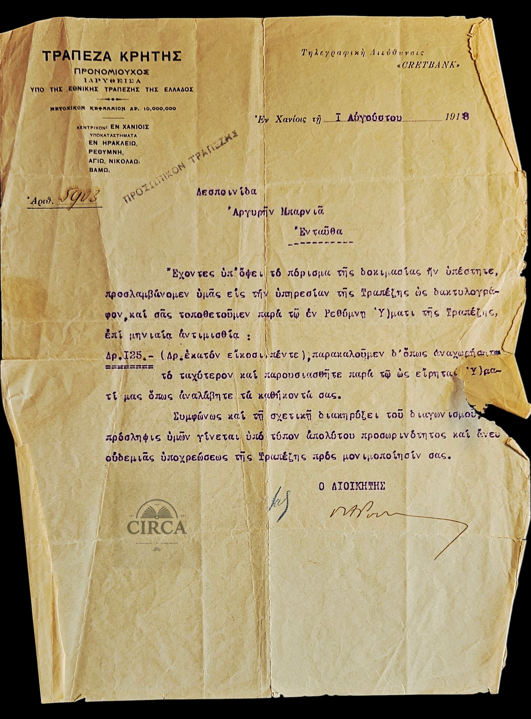 Original Greek bank employment letter, issued in 1918 by the Τράπεζα Κρήτης.