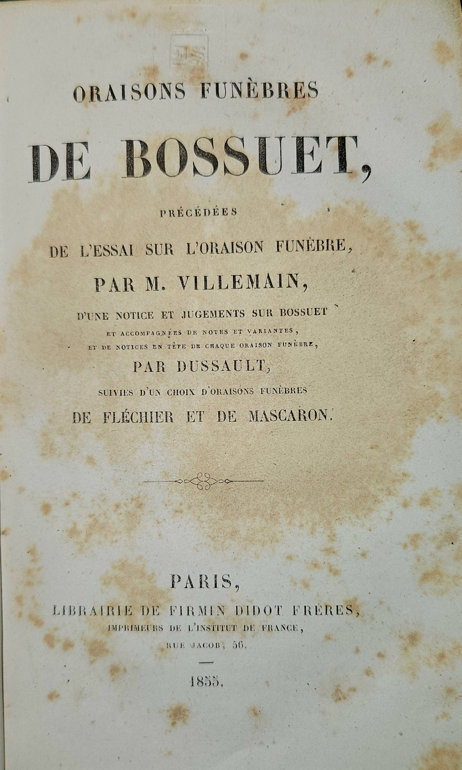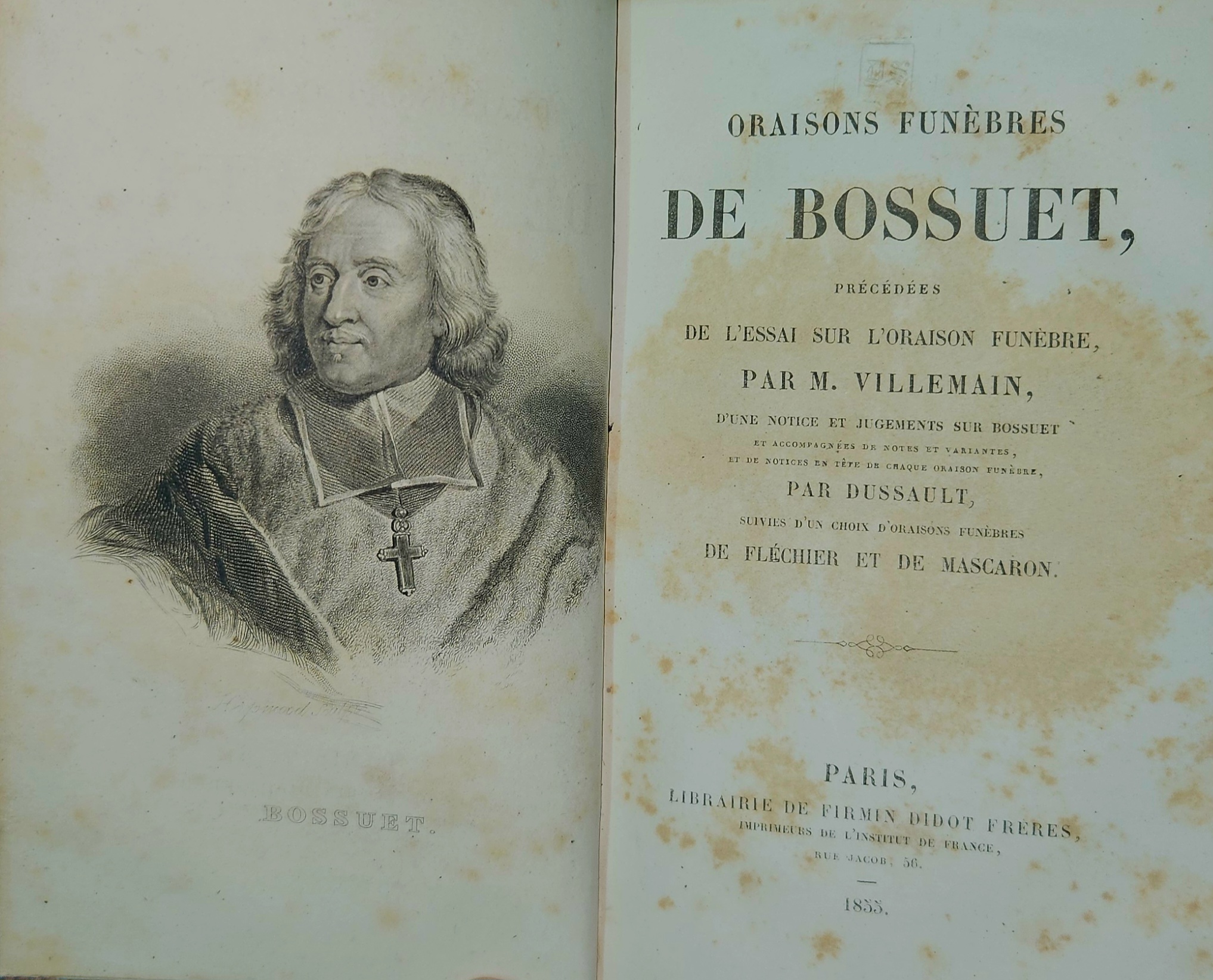 Original 1855 Paris edition of Oraisons Funèbres de Bossuet, printed by the prestigious Firmin Didot Frères, printers of the Institut de France.