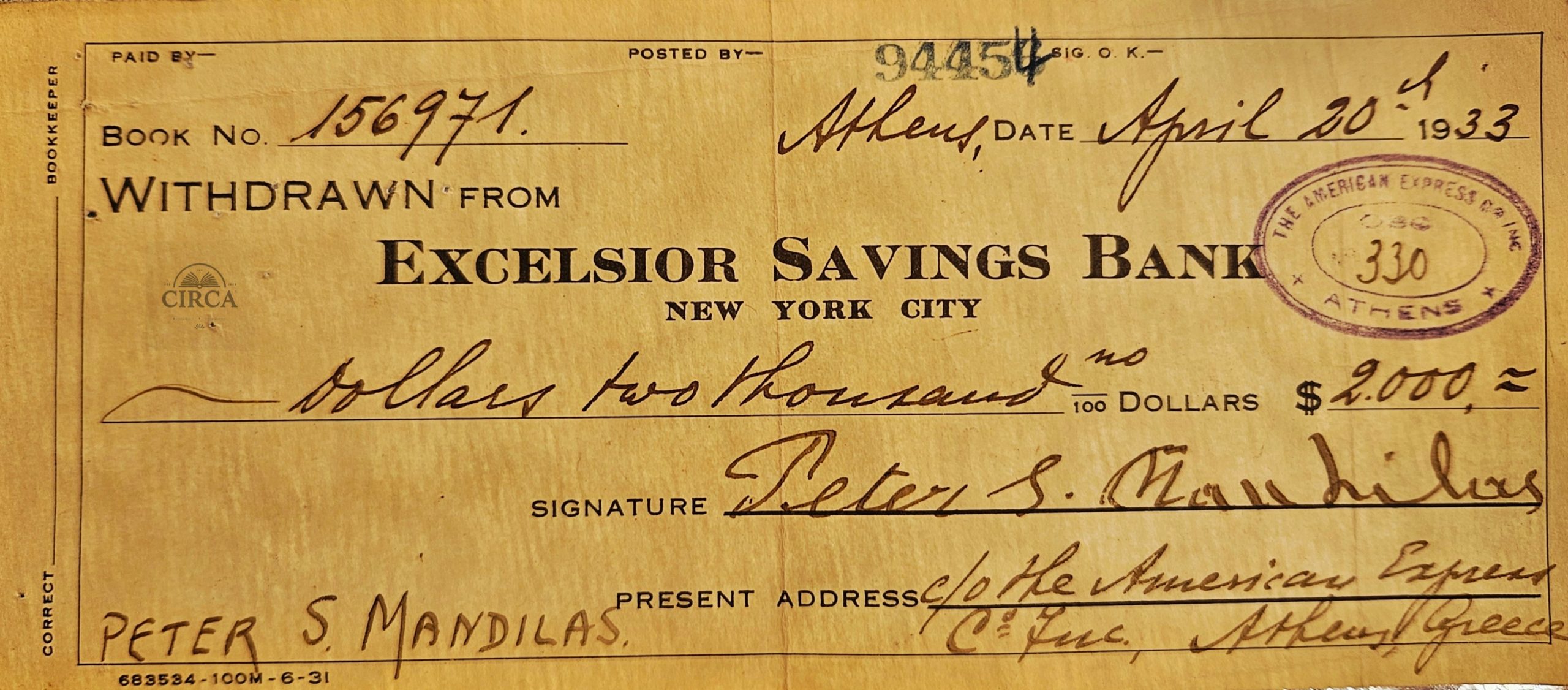 1933 Excelsior Savings Bank NYC Withdrawal Receipt – Athens American Express