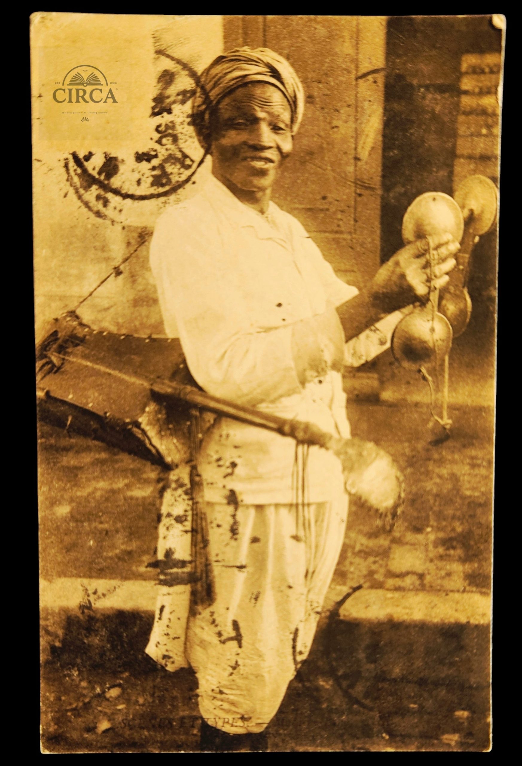 Original French colonial printed postcard, postmarked 1918, published in Oran, Algeria, depicting an ethnographic street musician holding traditional percussion instruments.