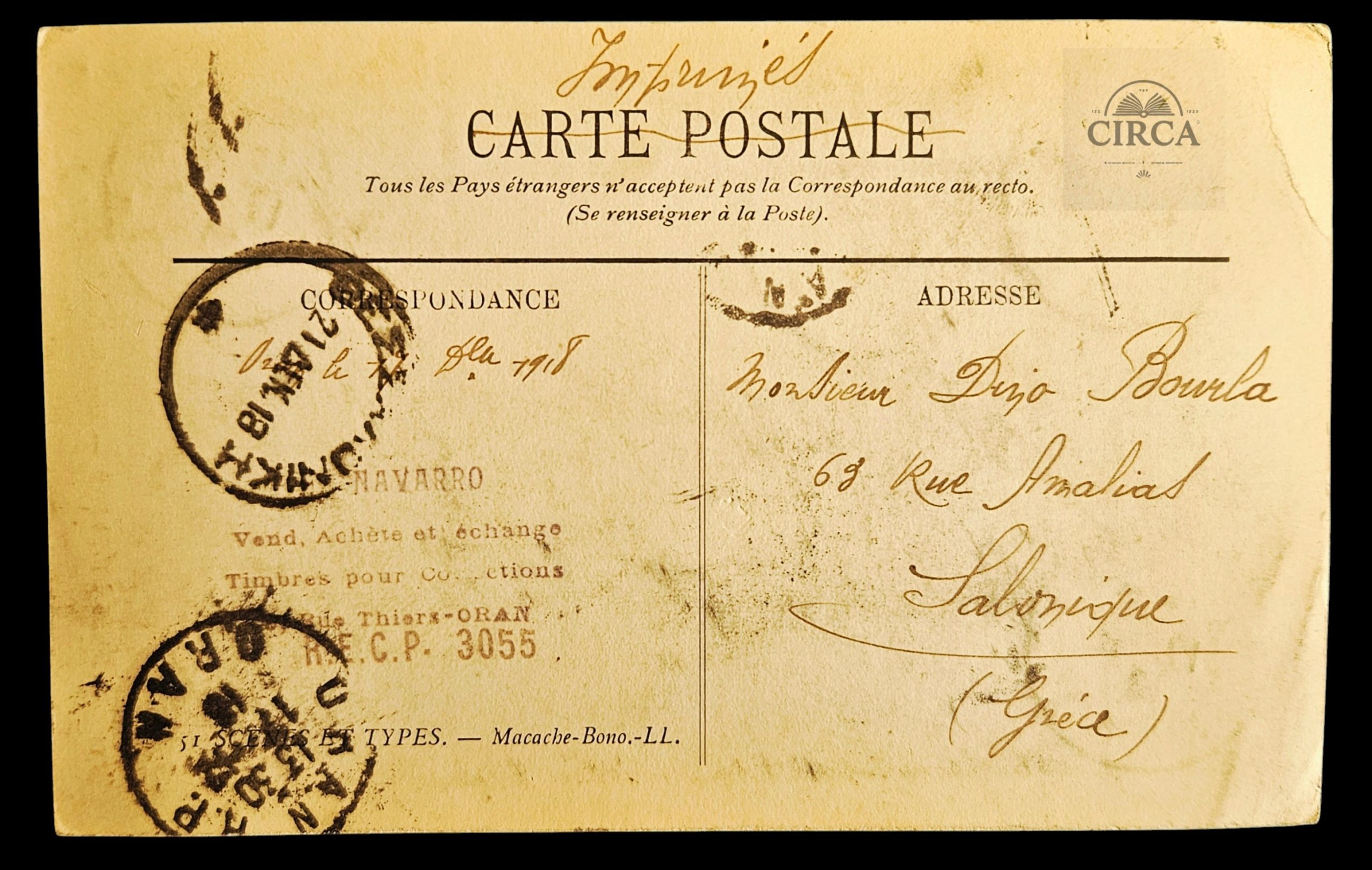 The postcard is postally used, showing a clear Oran (Algeria) dispatch cancel and a Salonica (Thessaloniki, Greece) arrival cancel