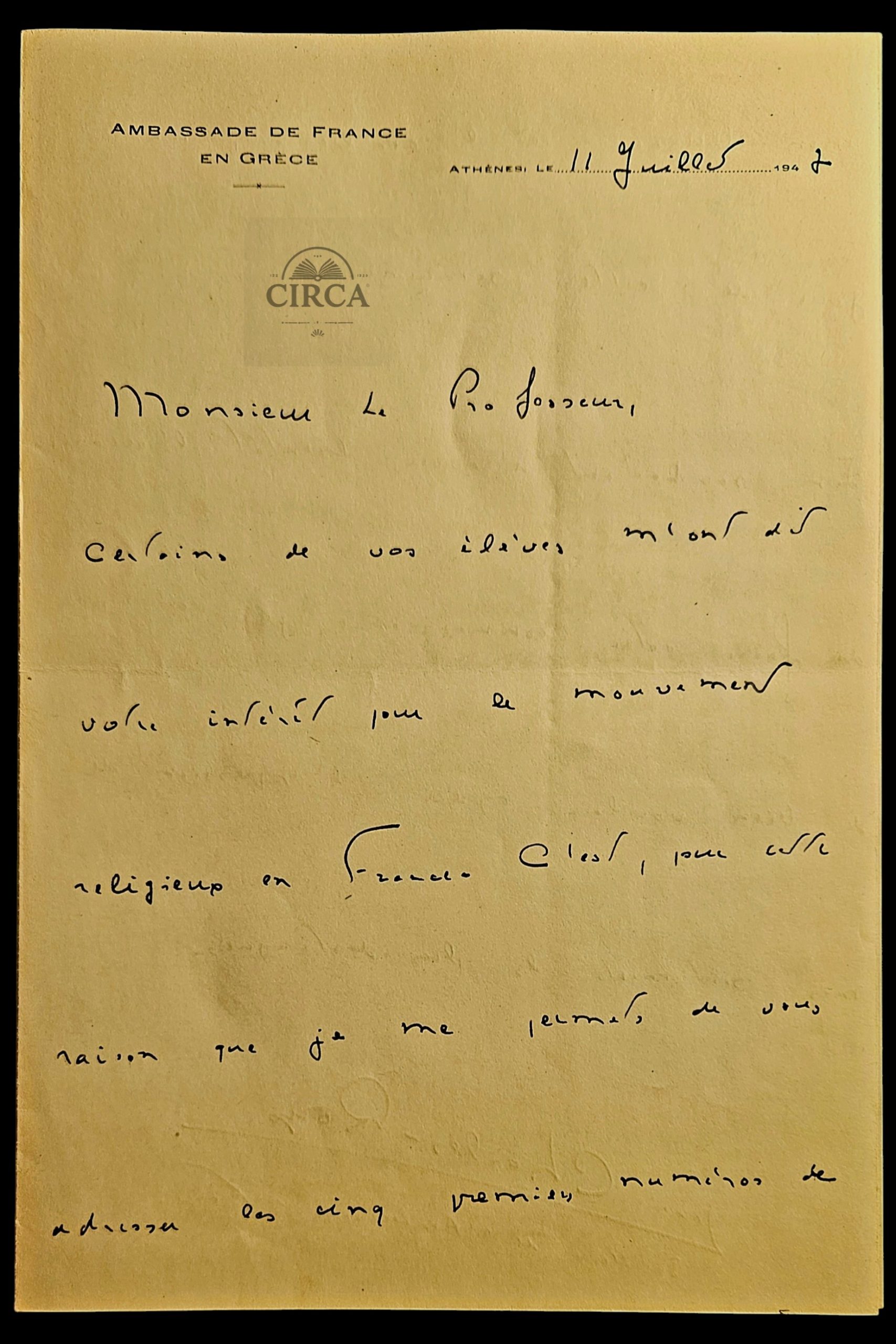 Original diplomatic correspondence from the French Embassy in Athens, dated 11 July 1942, during the Axis occupation of Greece and the period of Vichy France.