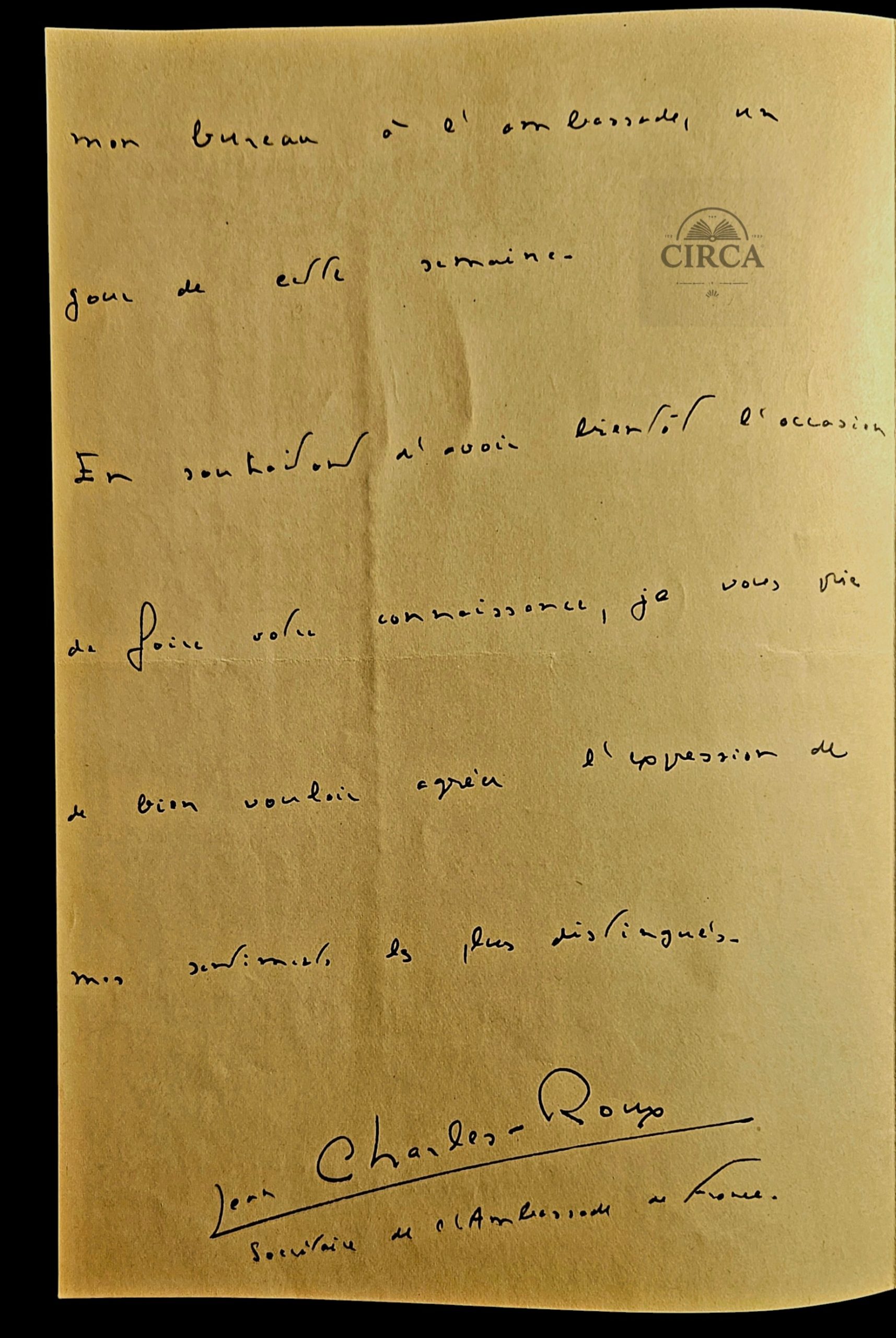 This letter is handwritten and signed by Jean Charles-Roux, identified in the signature as “Secrétaire de l’Ambassade” (Secretary of the French Embassy), a senior French diplomatic official.