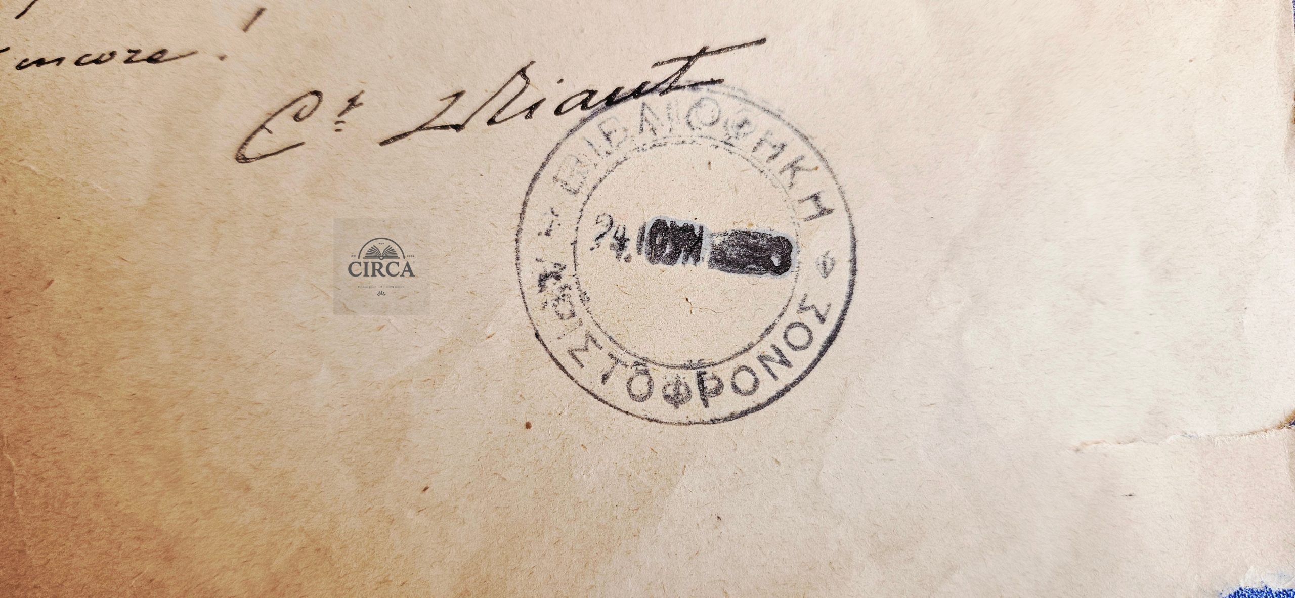 The sheet bears a circular ownership stamp from the “Aristophonos Library”, indicating provenance from a private historical collection.