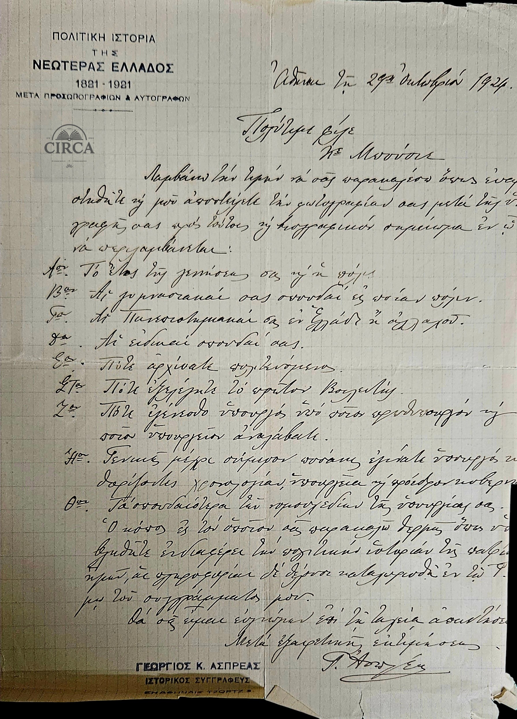 Original handwritten letter by the Greek historian Georgios K. Aspreas, author of the monumental multi-volume “Political History of Modern Greece (1821–1921)”, dated October 29, 1924.