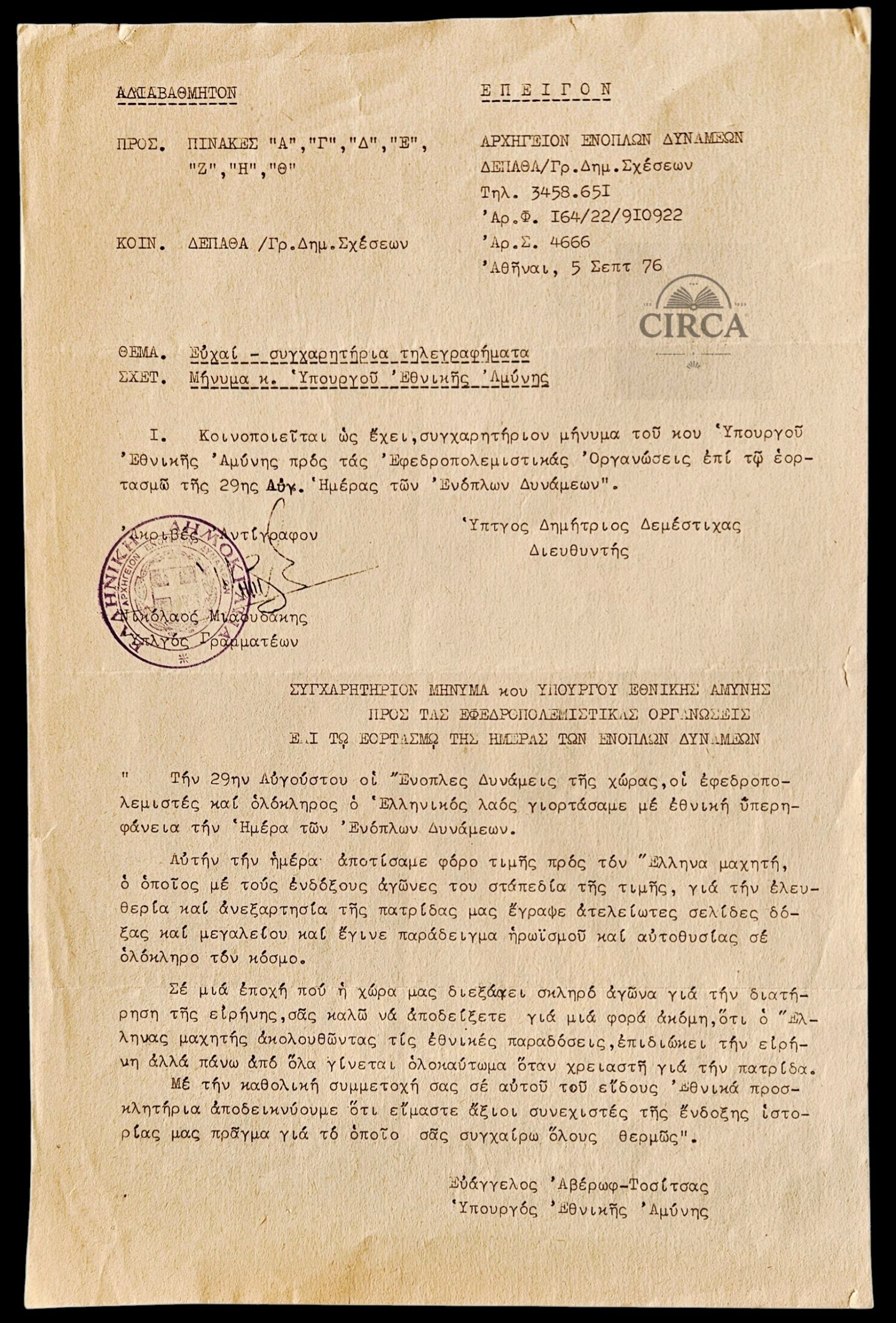 Original official document issued by the Greek Armed Forces Headquarters, dated 1976.