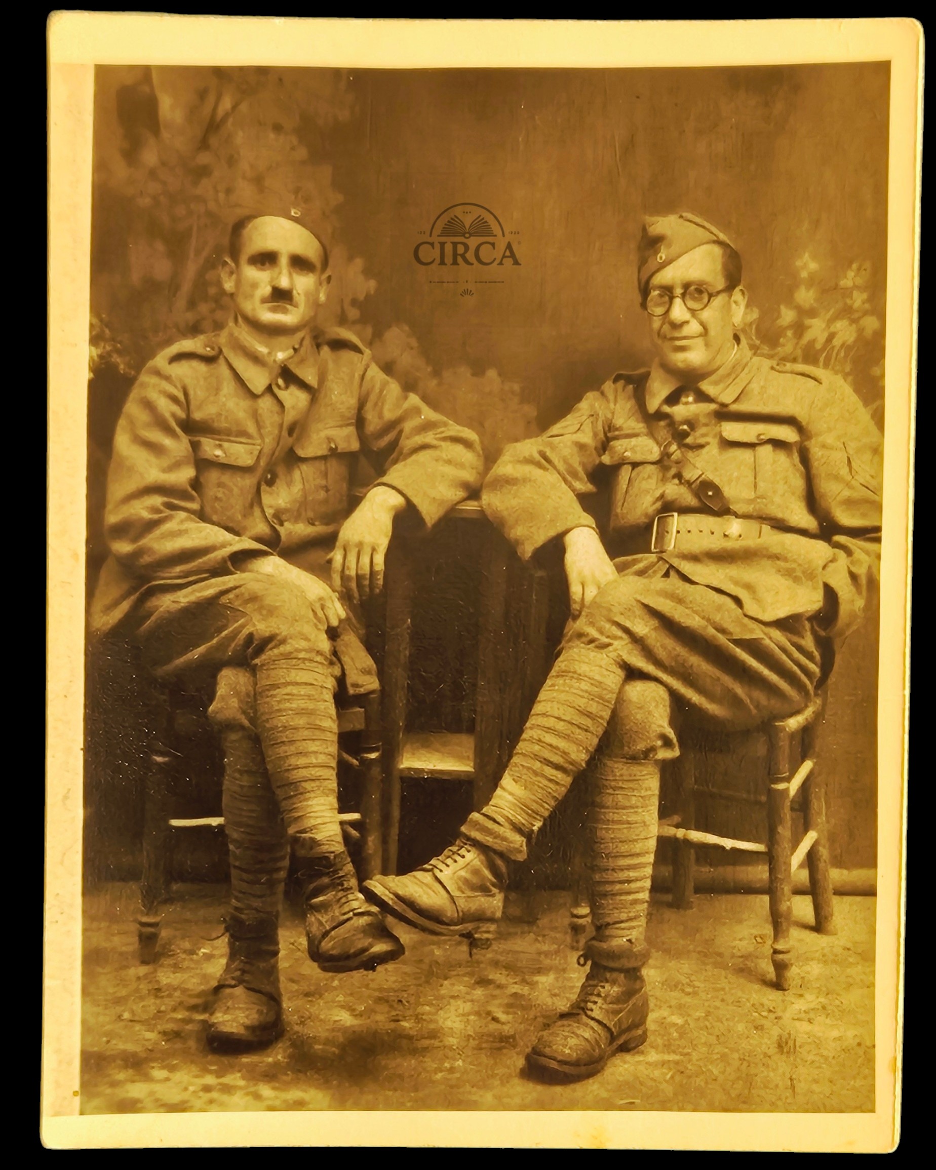Original vintage studio photograph depicting two soldiers in uniform, seated pose.