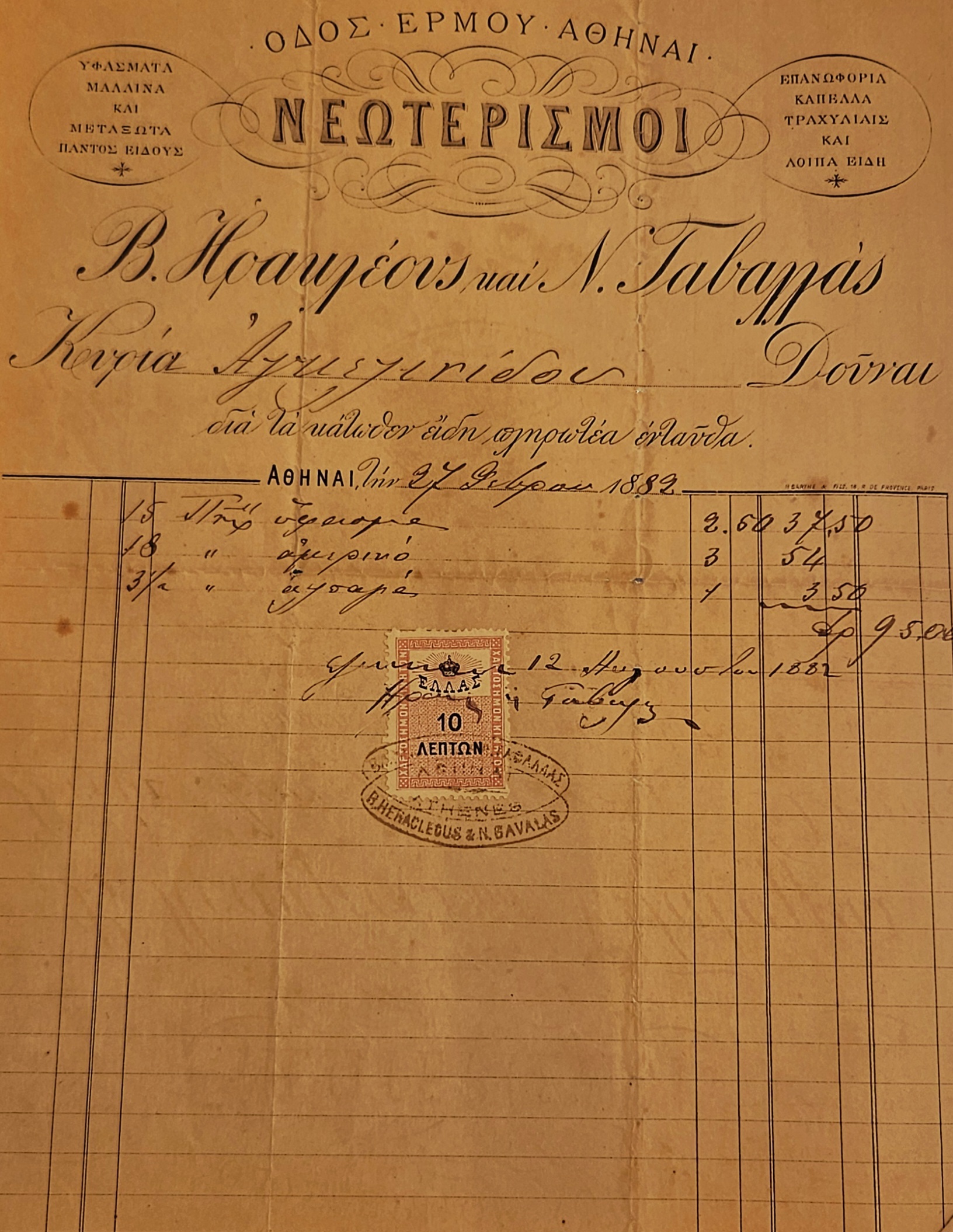 Original 1882 Greek commercial receipt from the well-known Athens shop “Neoterismoi”, located on Ermou Street, the main commercial avenue of the city.