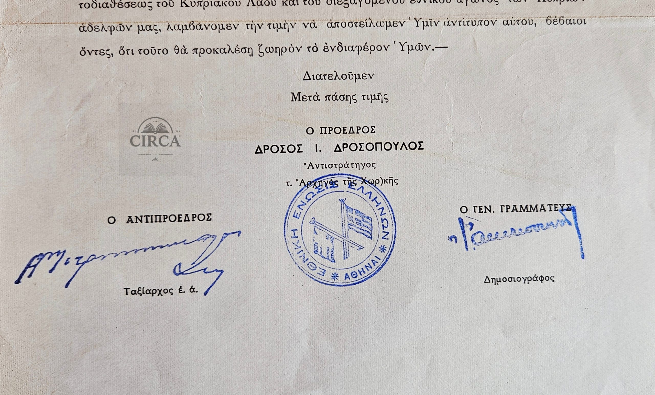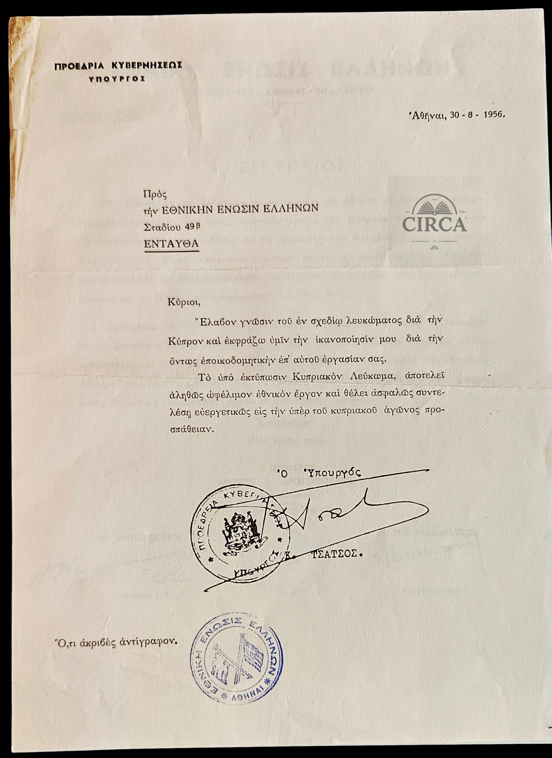 • Signed by: Constantinos Tsatsos (then Minister; later President of the Hellenic Republic)