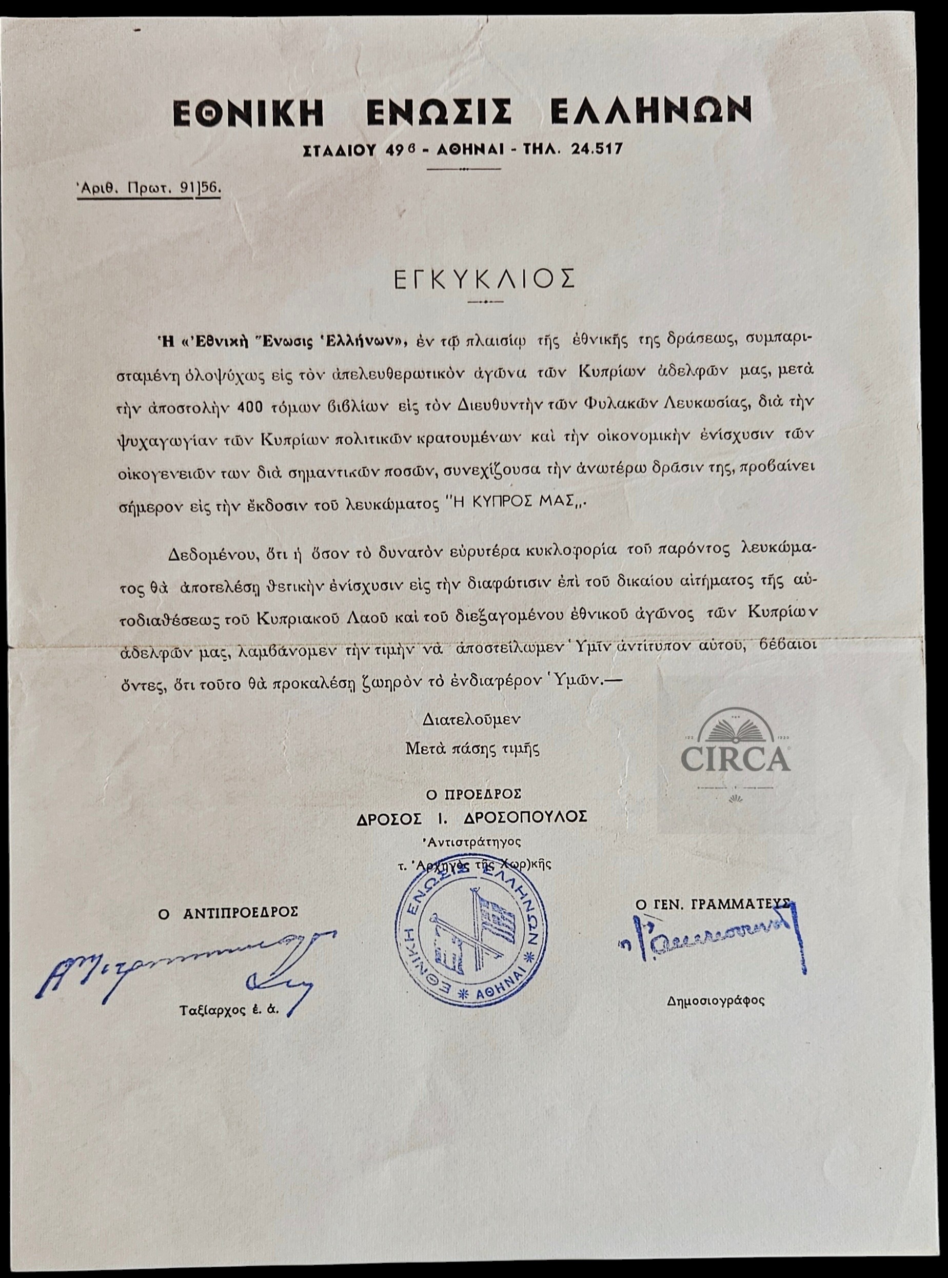 Official circular (Εγκύκλιος) of the National Union of Greeks, protocol no. 91/1956.