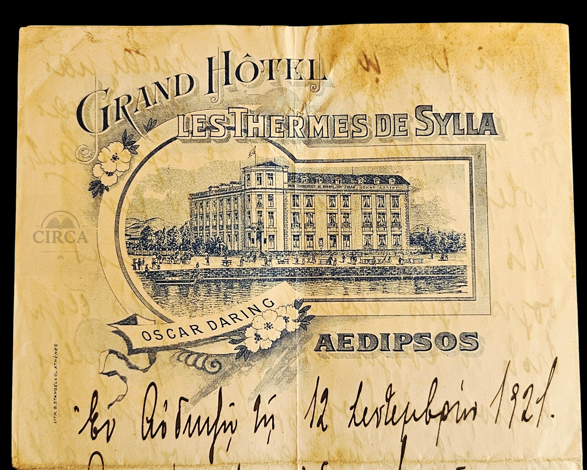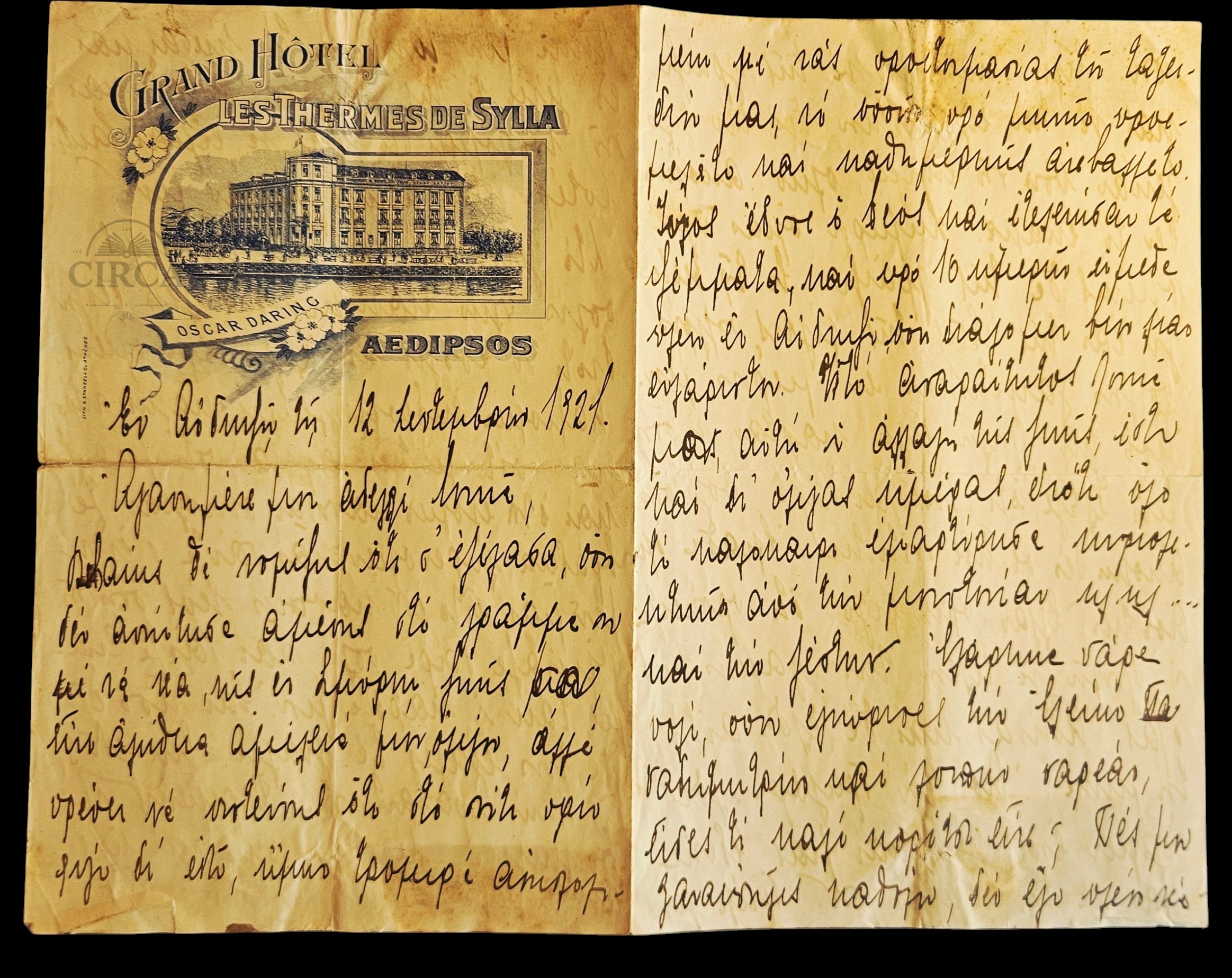 Original four-page handwritten letter, written in Greek and dated September 12, 1921, on the illustrated lithographed letterhead of the historic Grand Hôtel – Les Thermes de Sylla.