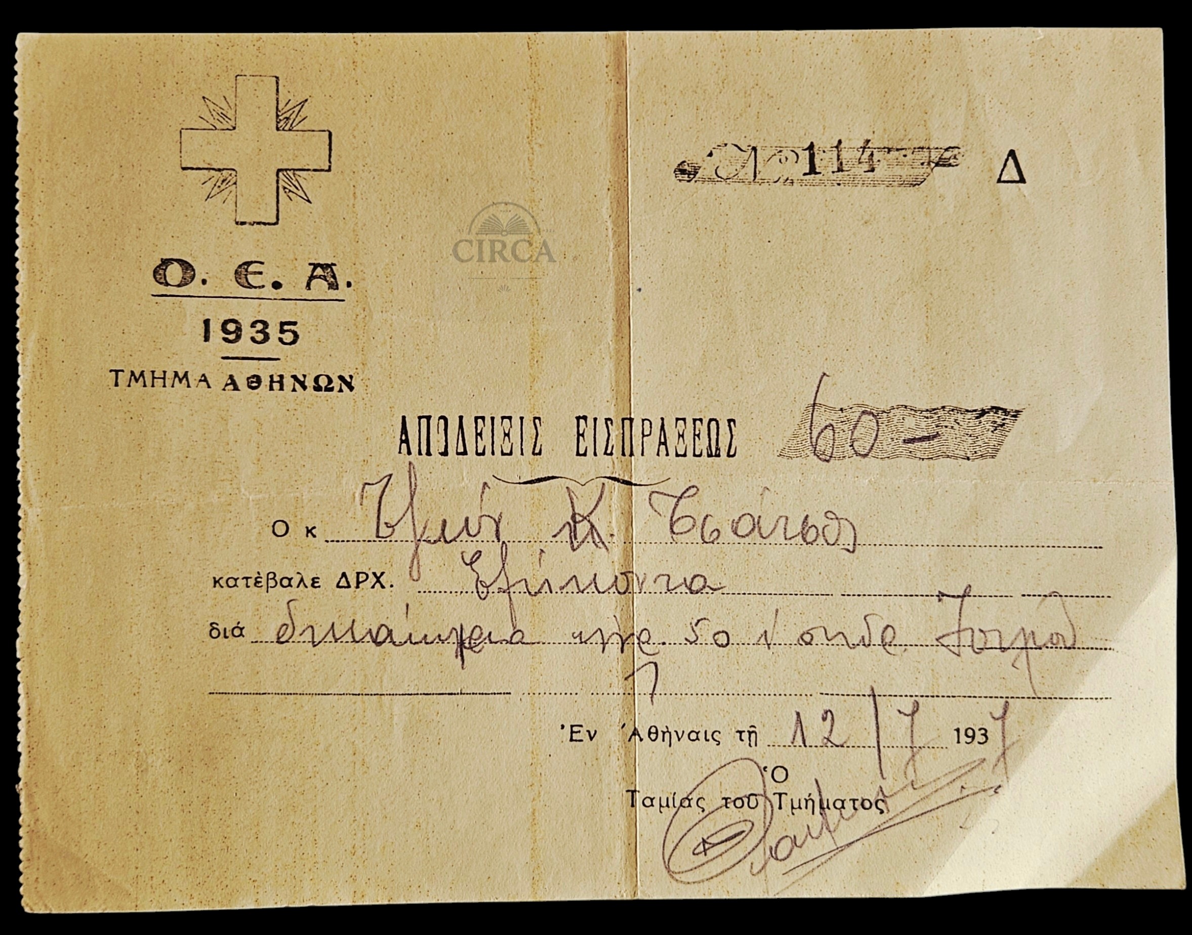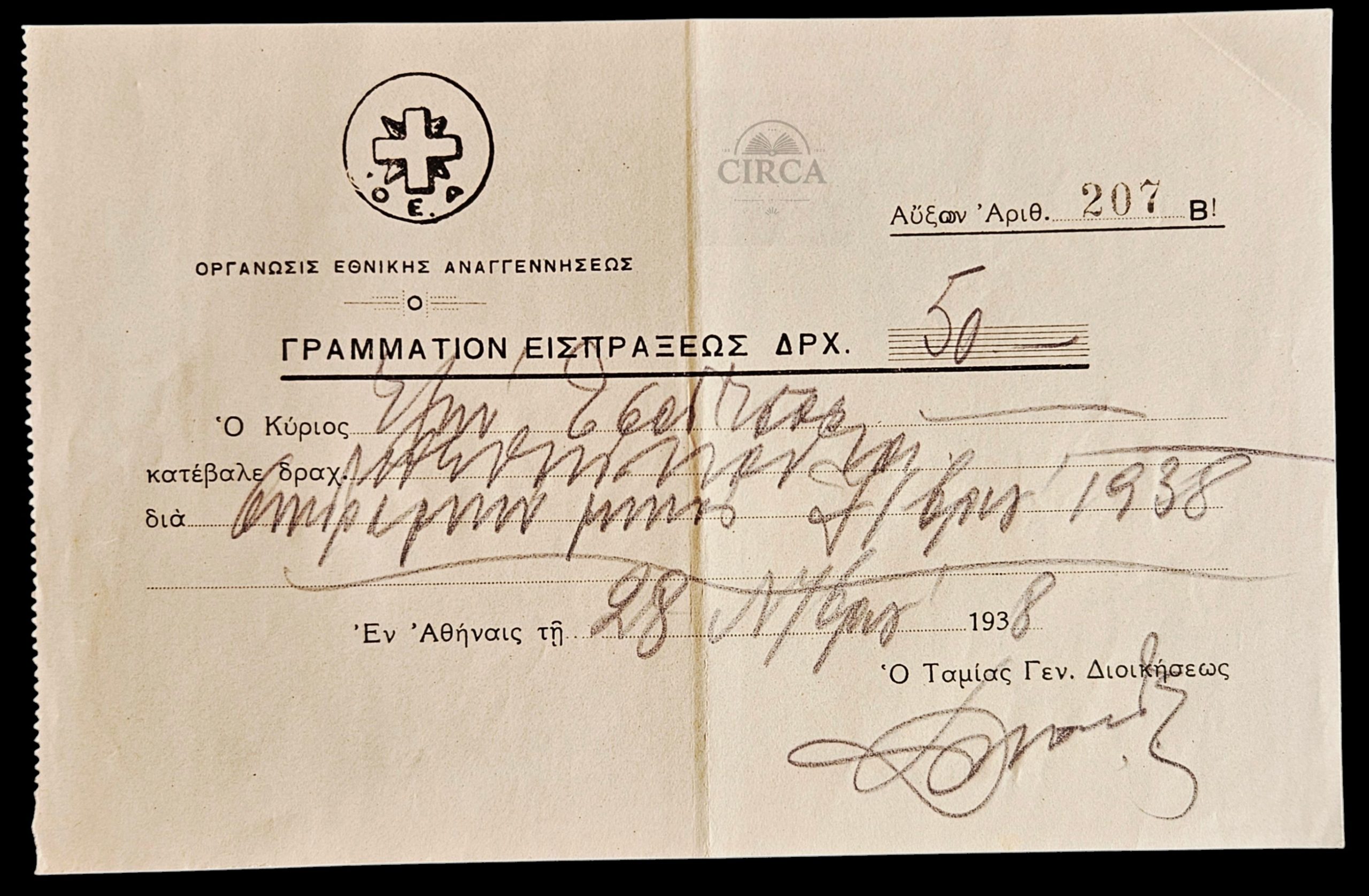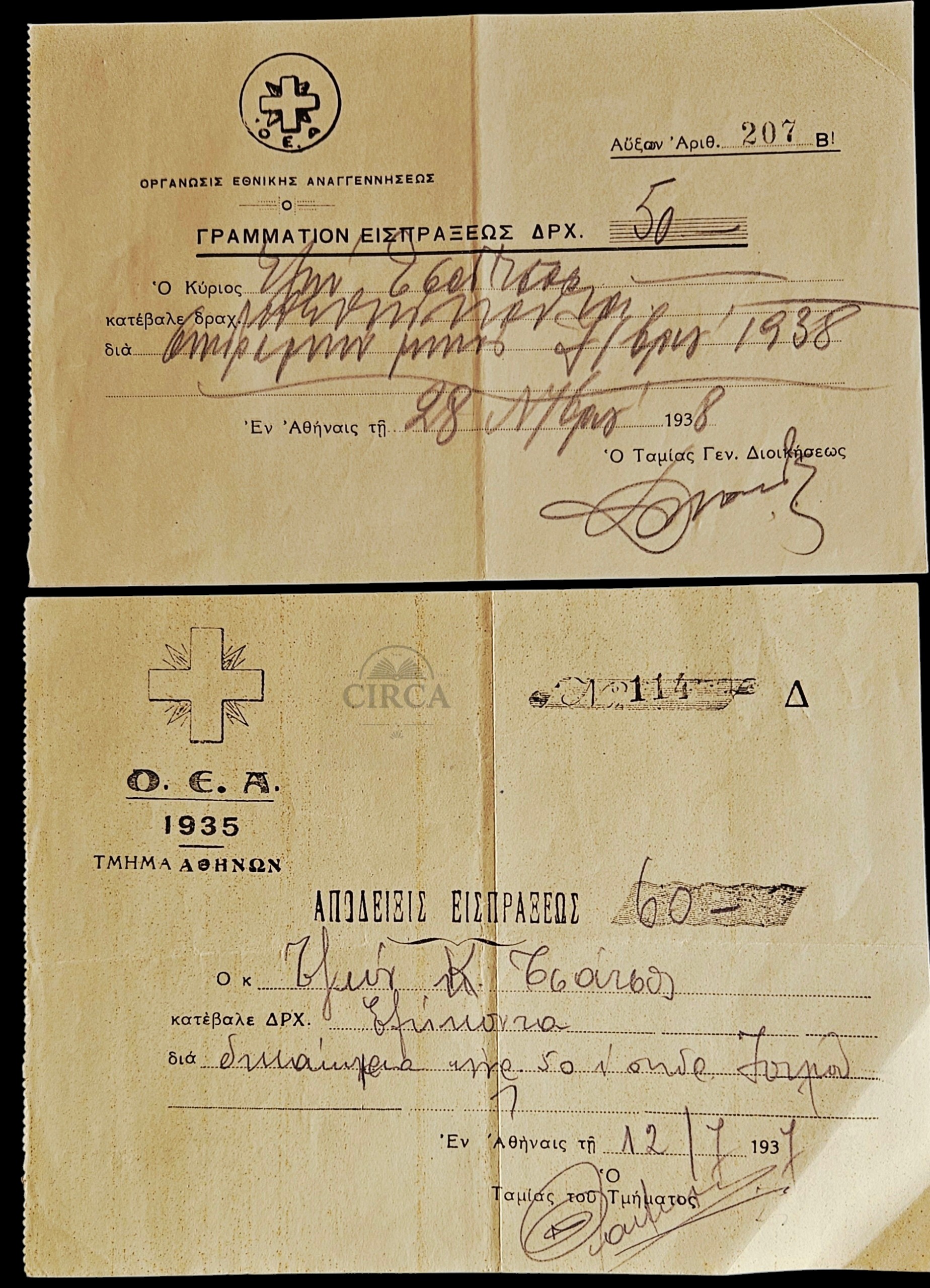 These documents were issued by O.E.A. (Organization of National Regeneration), a Greek organization active in Athens in the late 1930s, and illustrate the everyday administrative and institutional practices of Greece in the interwar era.