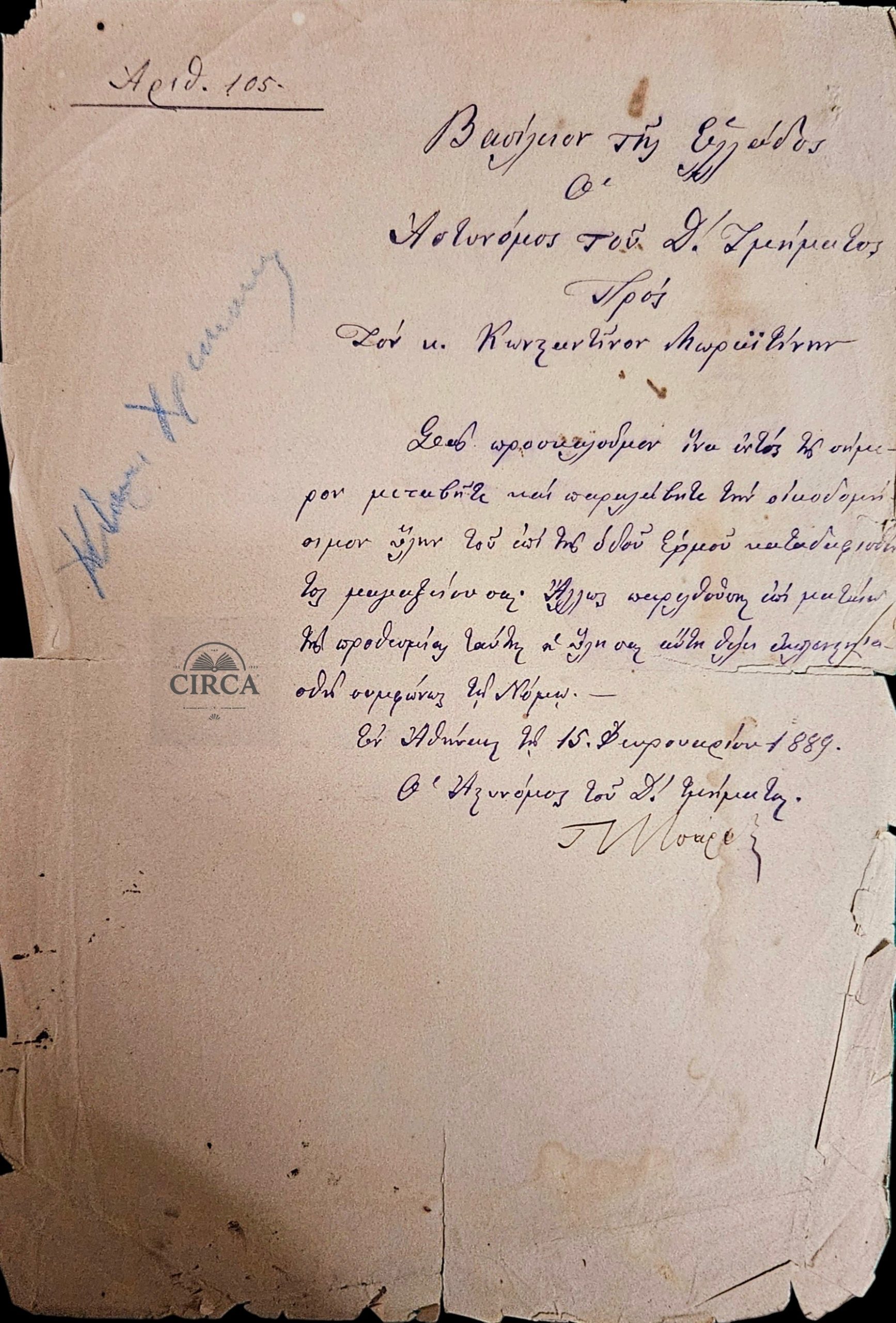 1889 Greek Police Document – Athens – Handwritten Administrative Letter