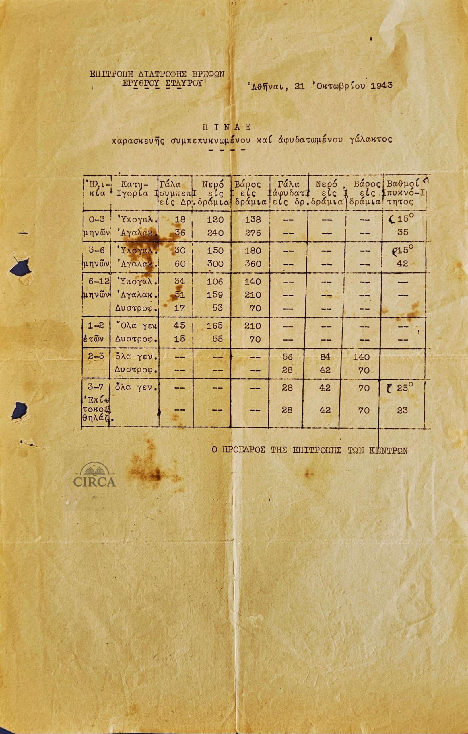 The document contains a detailed table of instructions for preparing condensed and dehydrated milk for infants and children, categorized by age groups, quantities of milk, water, and nutritional ratios. It is a direct witness to the Great Famine of occupied Greece (1941–1944) and the humanitarian efforts to keep children alive under extreme conditions.