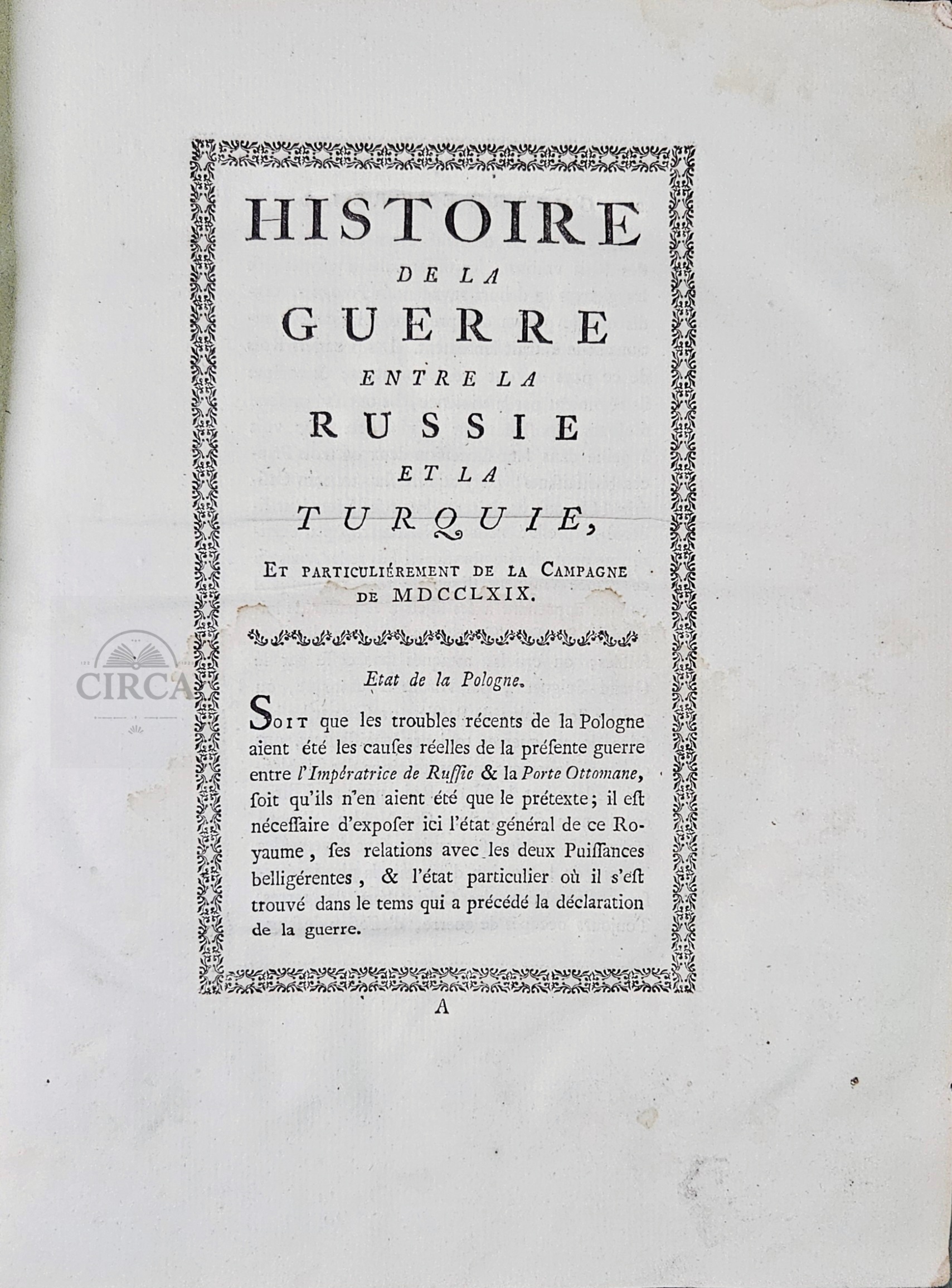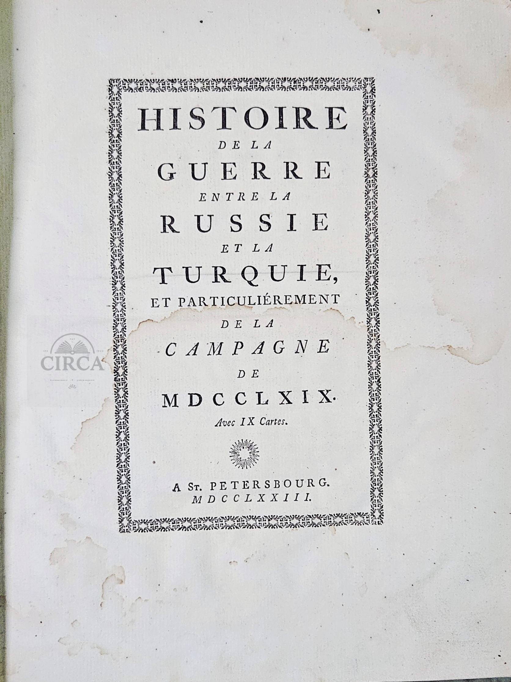 History of the War between Russia and Turkey, and especially of the Campaign of 1769 – St. Petersburg, 1773 — Histoire de la Guerre entre la Russie et la Turquie, et particulièrement de la Campagne de 1769. St. Petersburg, 1773.