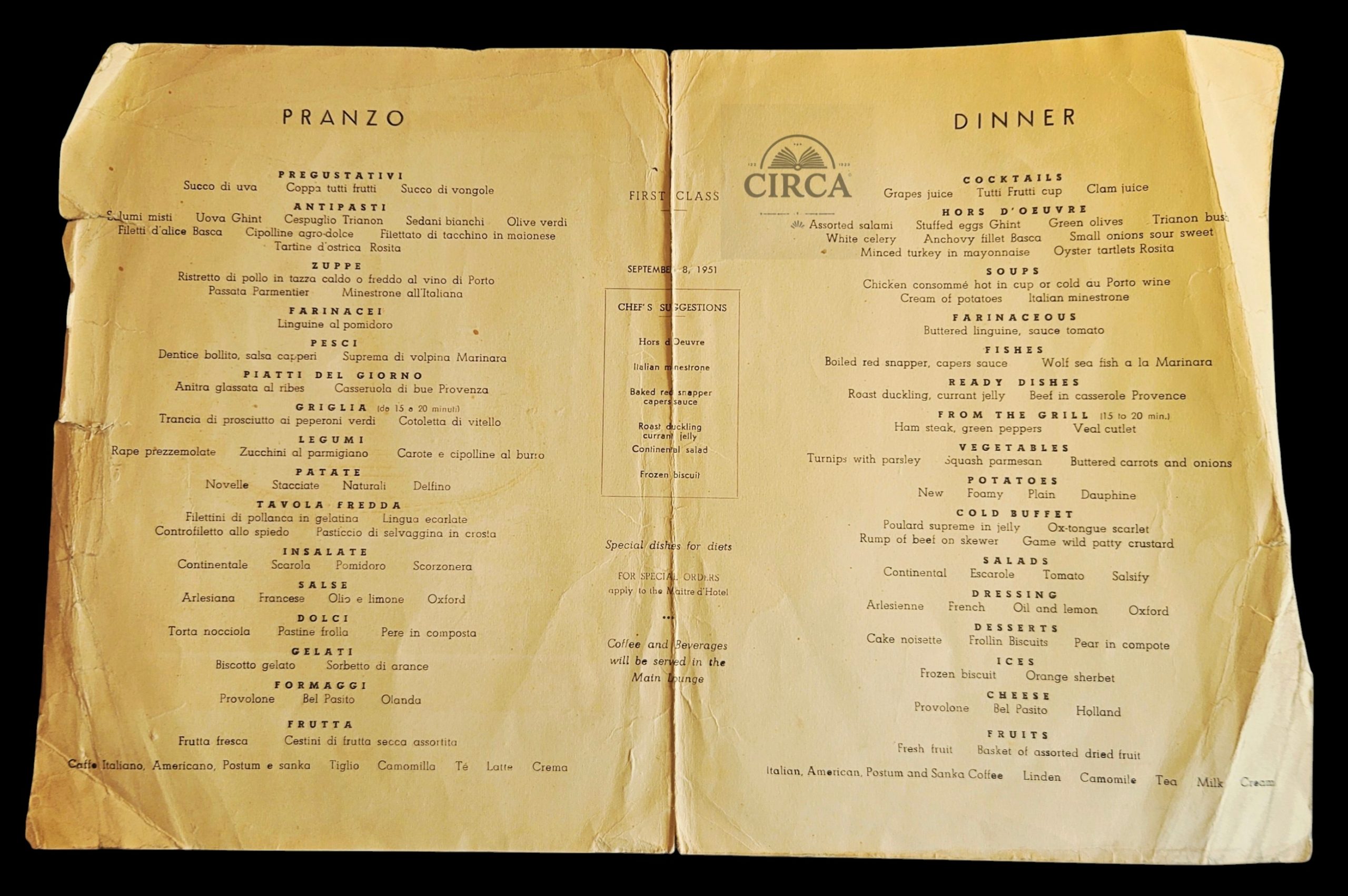 Original First Class ship menu from the Italian ocean liner company Italia Linee / Home Lines, dated September 8, 1951.