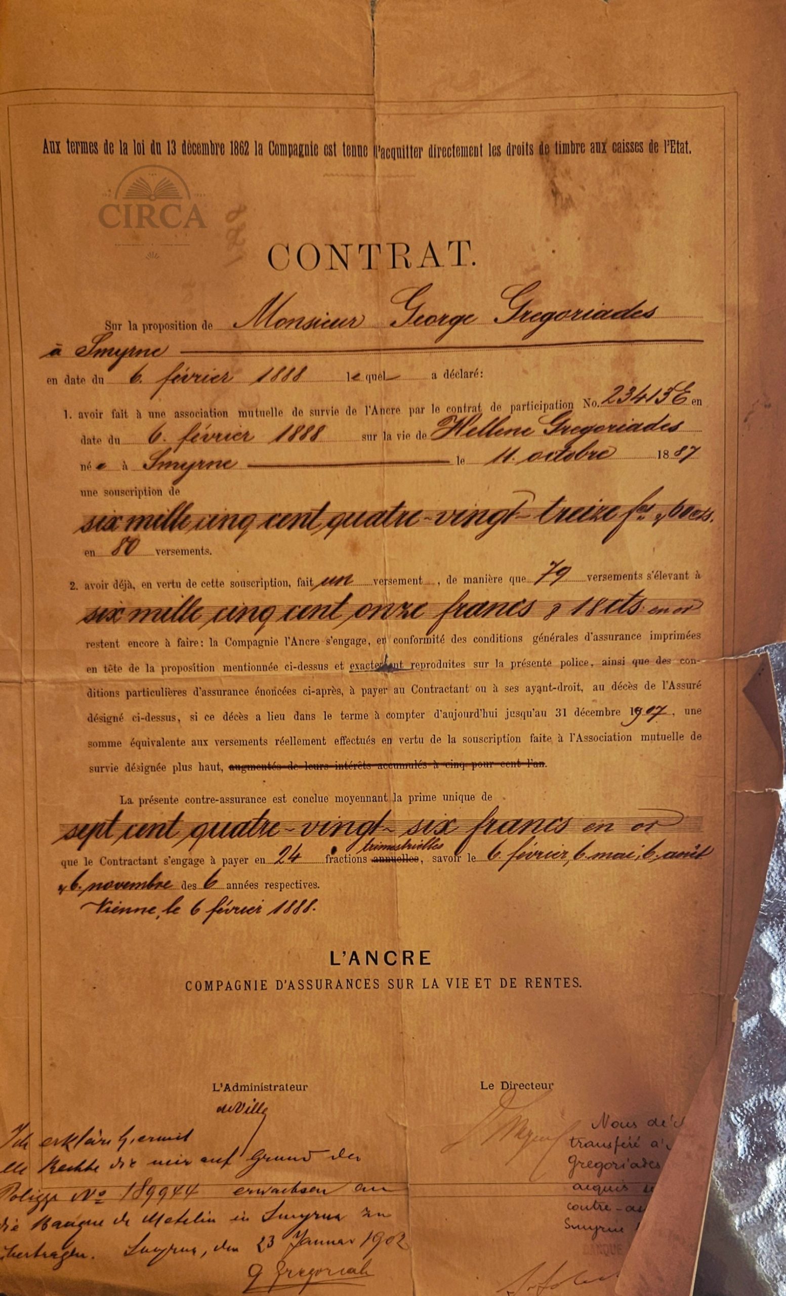 Life Insurance Contract – L’Ancre Company, Vienna & Smyrna (1888–1912)