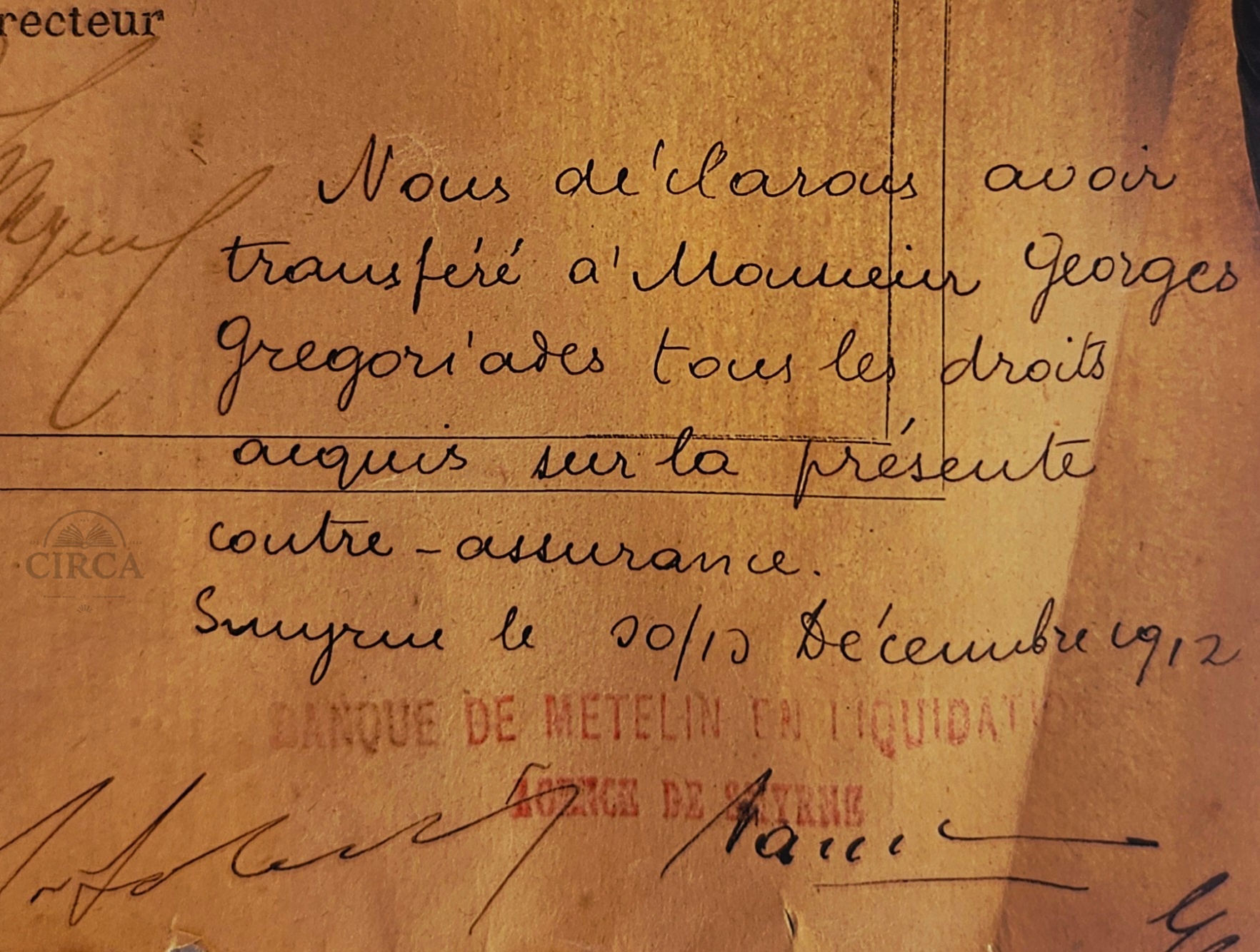 Original life insurance policy issued by L’Ancre – Compagnie d’Assurances sur la Vie et de Rentes, headquartered in Vienna, Austria. The contract is dated 6 February 1888 and later endorsed in 1912 with the red stamp of the “Banque de Metelin en liquidation” (Smyrna/Lesvos), confirming the transfer of all rights attached to this policy.