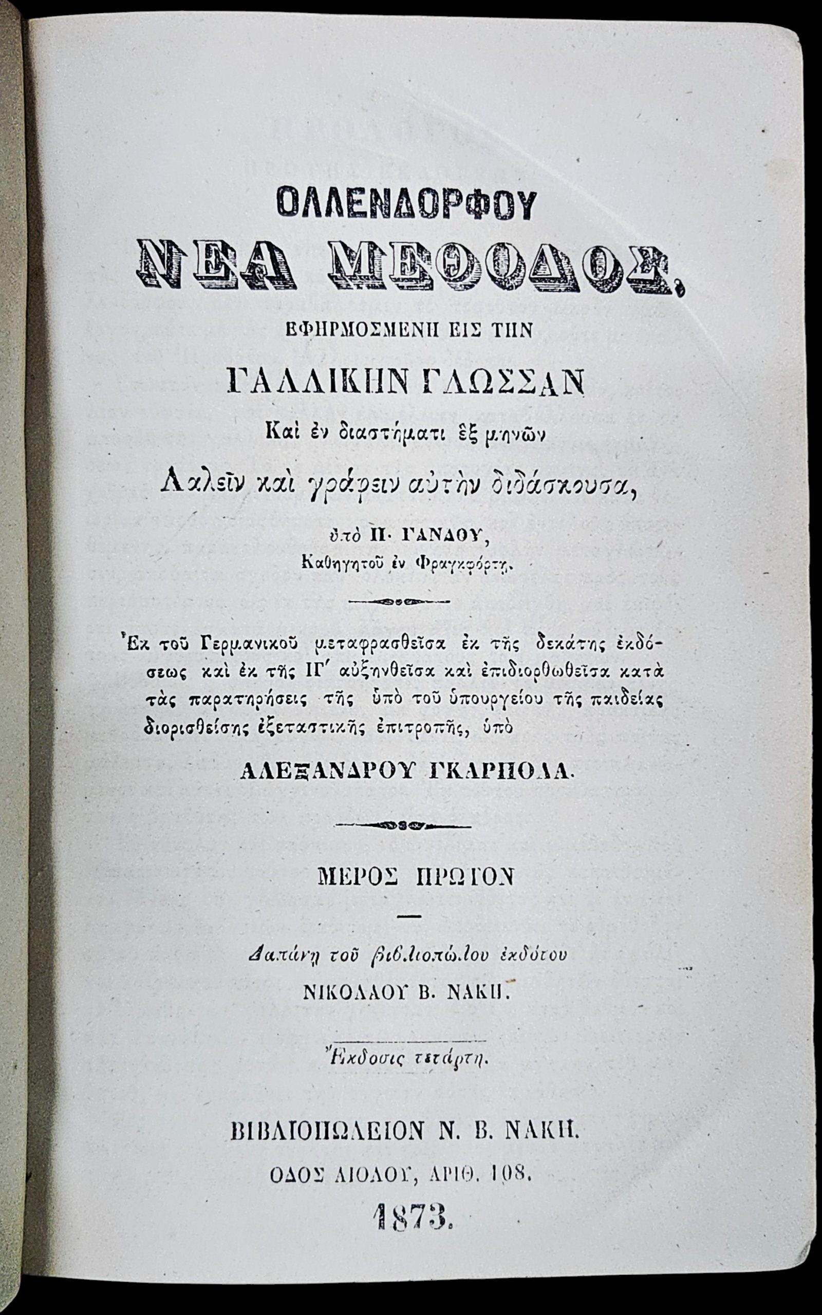 Full Greek Title: Ολλενδόρφφου Νέα Μέθοδος, εφαρμοσμένη εις την Γαλλικήν Γλώσσαν