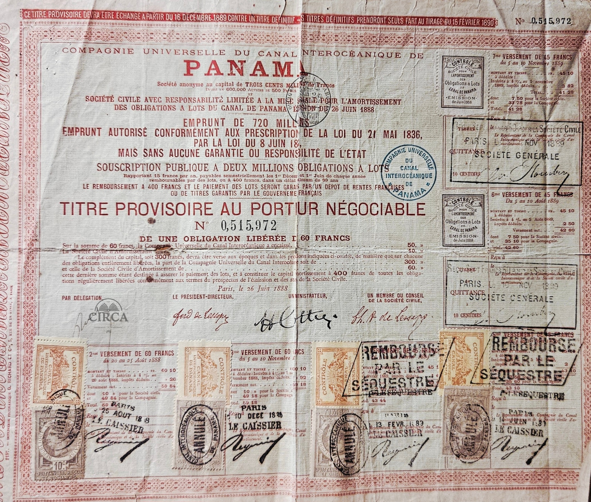 These historic financial documents were part of the major 720 million franc loan issued on 26 June 1888 to fund the first failed attempt to build the Panama Canal under Ferdinand de Lesseps.