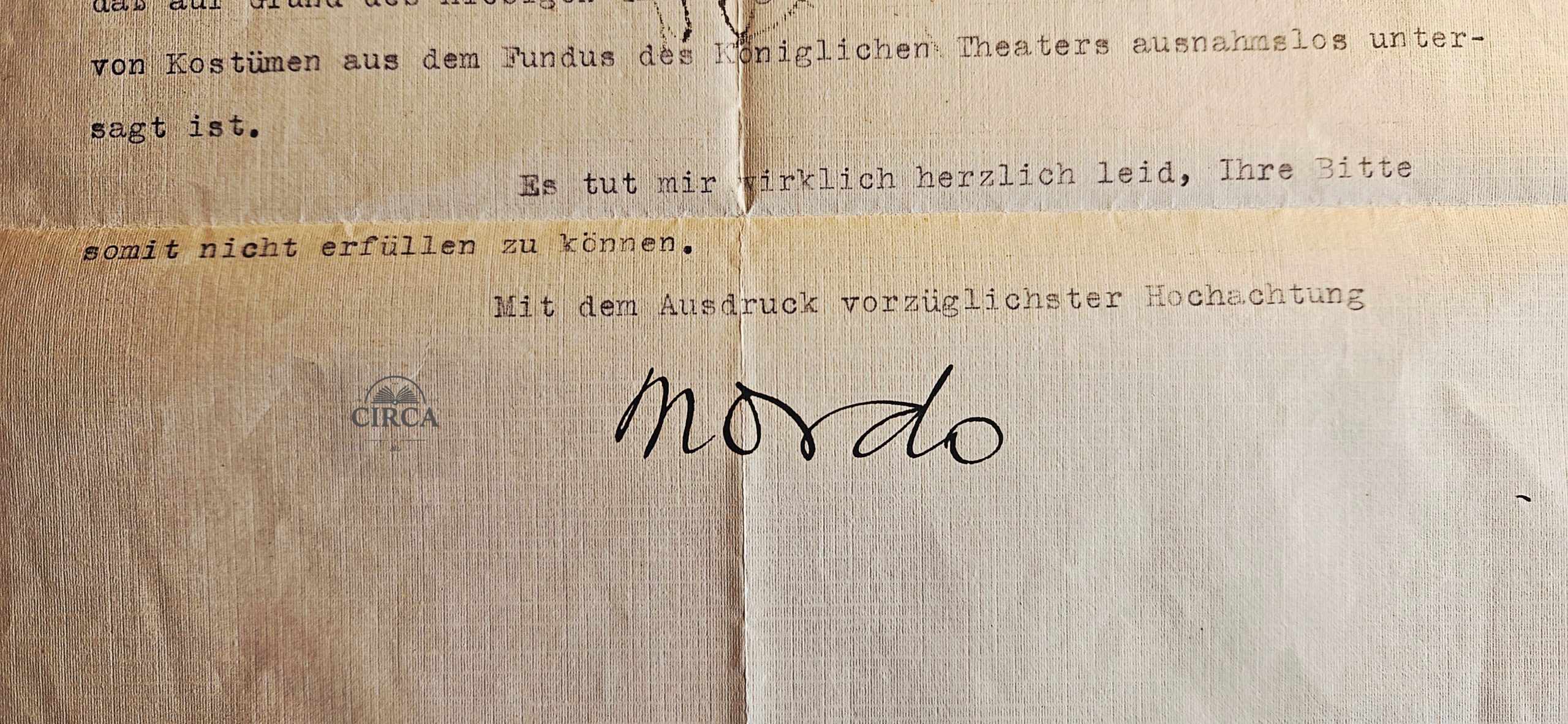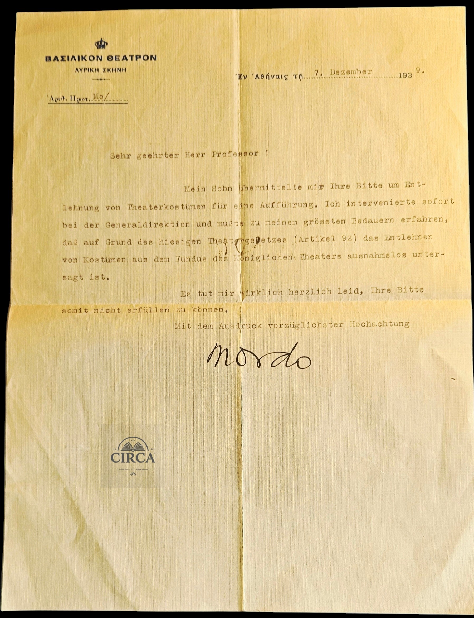 Typed letter on original Royal Theatre letterhead, written in German, and hand-signed by Renato Mordo, who served at the time as Director of the Lyric Stage during its early formative period.