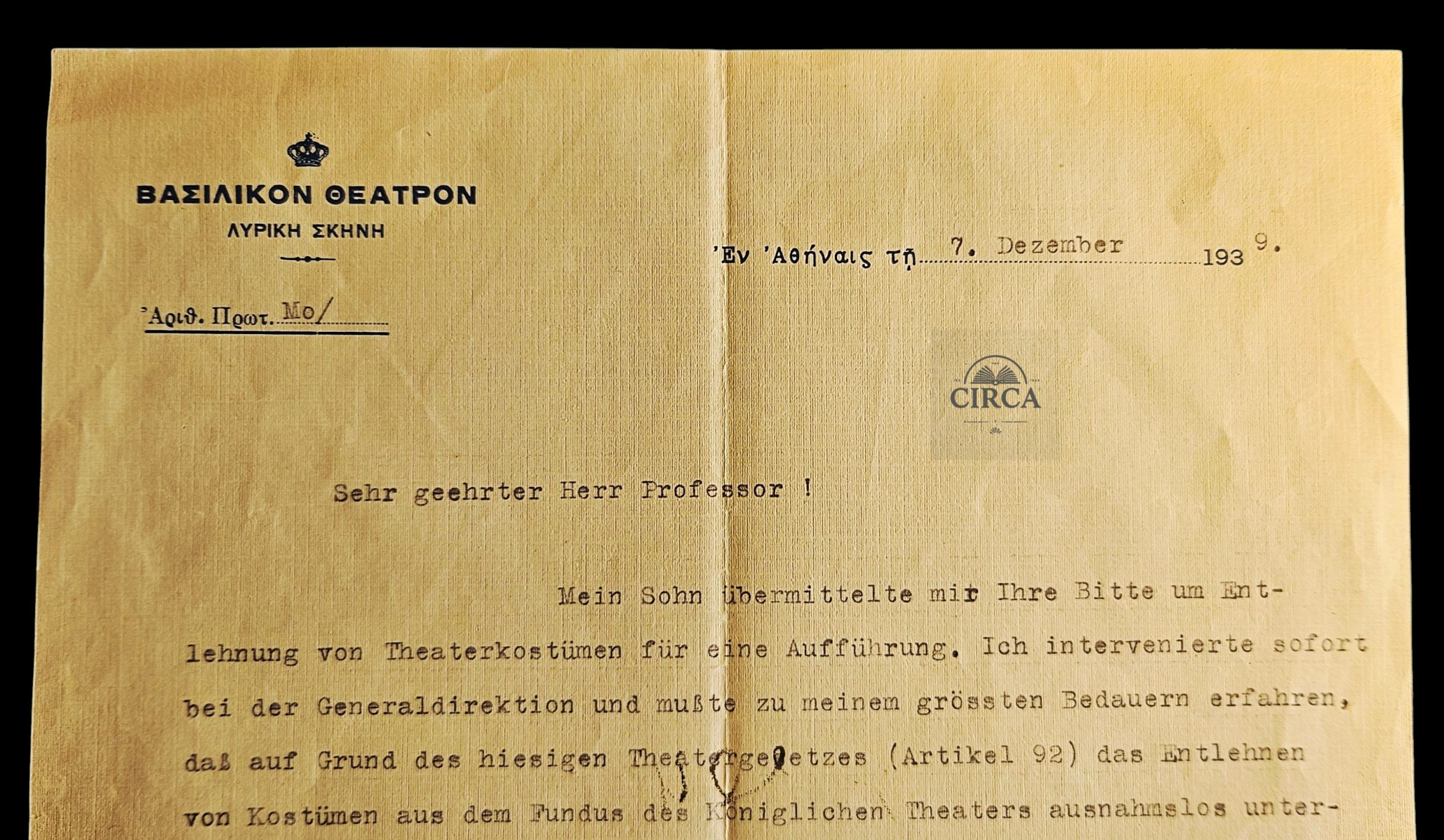 Rare official pre-World War II institutional letter issued by the Royal Theatre of Greece – Lyric Stage (Greek National Opera), dated 7 December 1939, Athens.