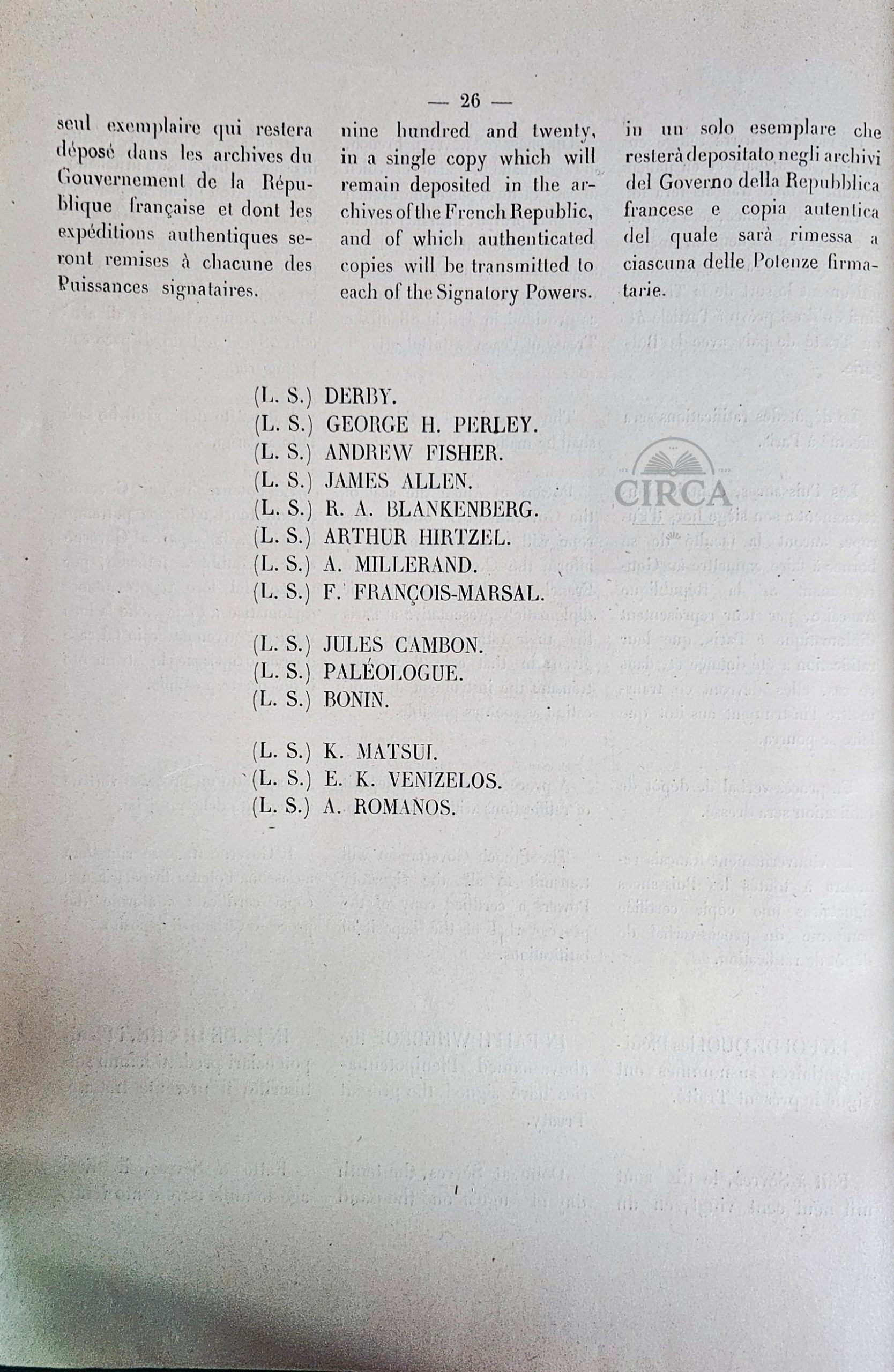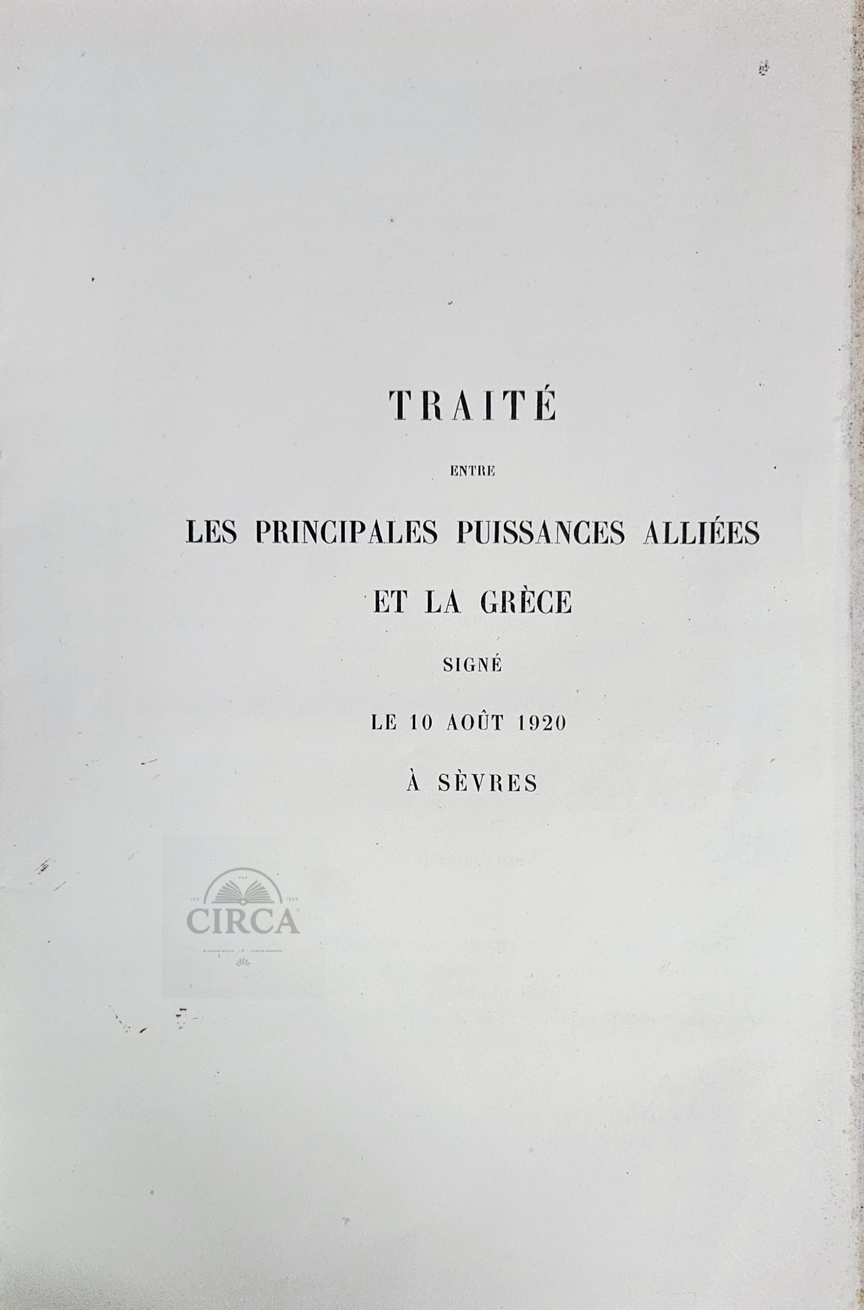 Original diplomatic pamphlet relating to the Treaty of Sèvres, signed at Sèvres on 10 August 1920 between the Principal Allied Powers and Greece. This rare 26-page publication contains the official text of the agreement in multiple languages, reflecting the international diplomatic framework of the post–World War I settlement.