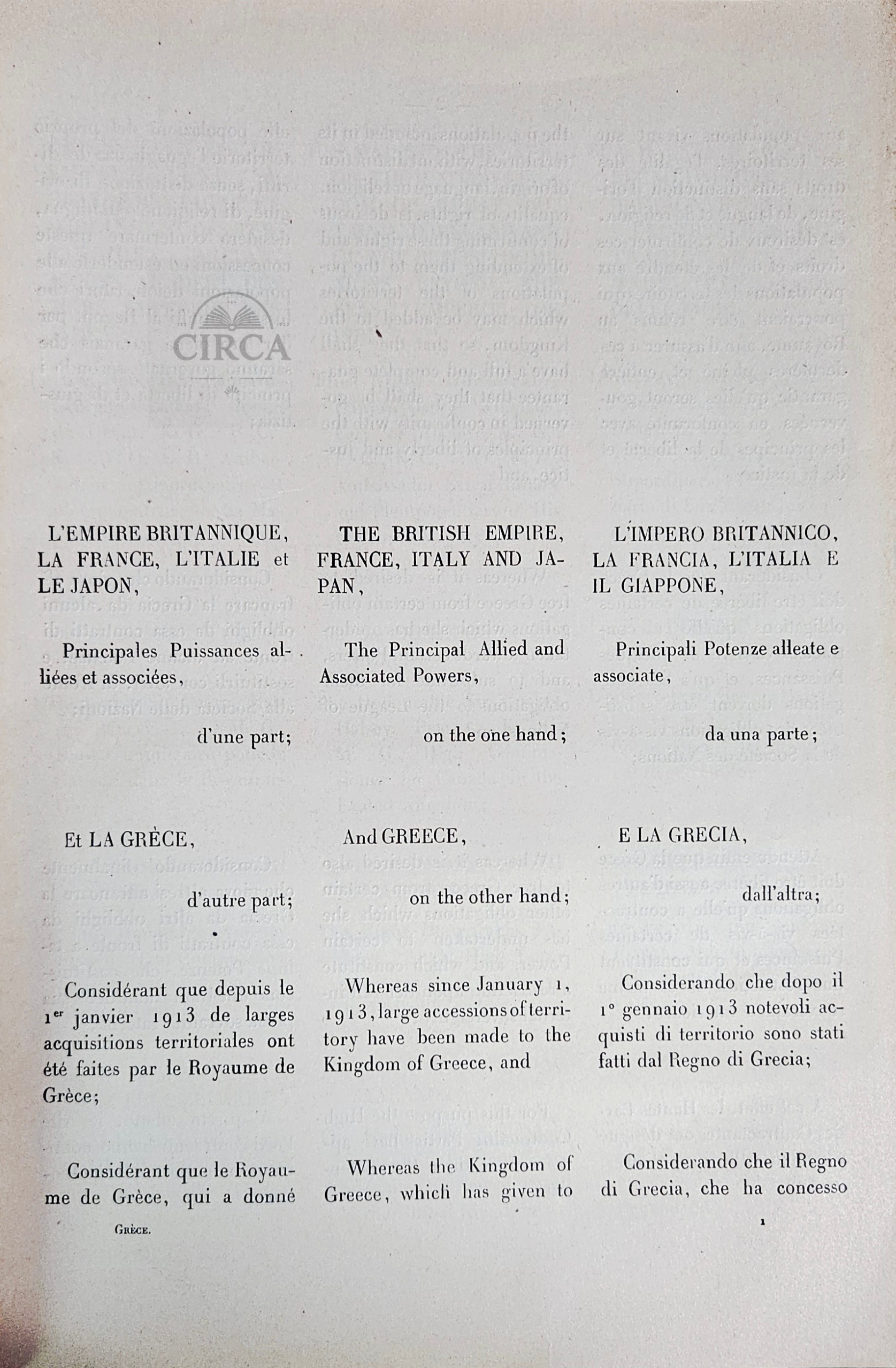 The document records the agreement between the British Empire, France, Italy, Japan, and Greece and represents a significant moment in modern Greek and European political history. The treaty formed part of the wider settlement that reshaped territorial arrangements in the Eastern Mediterranean following the First World War.
