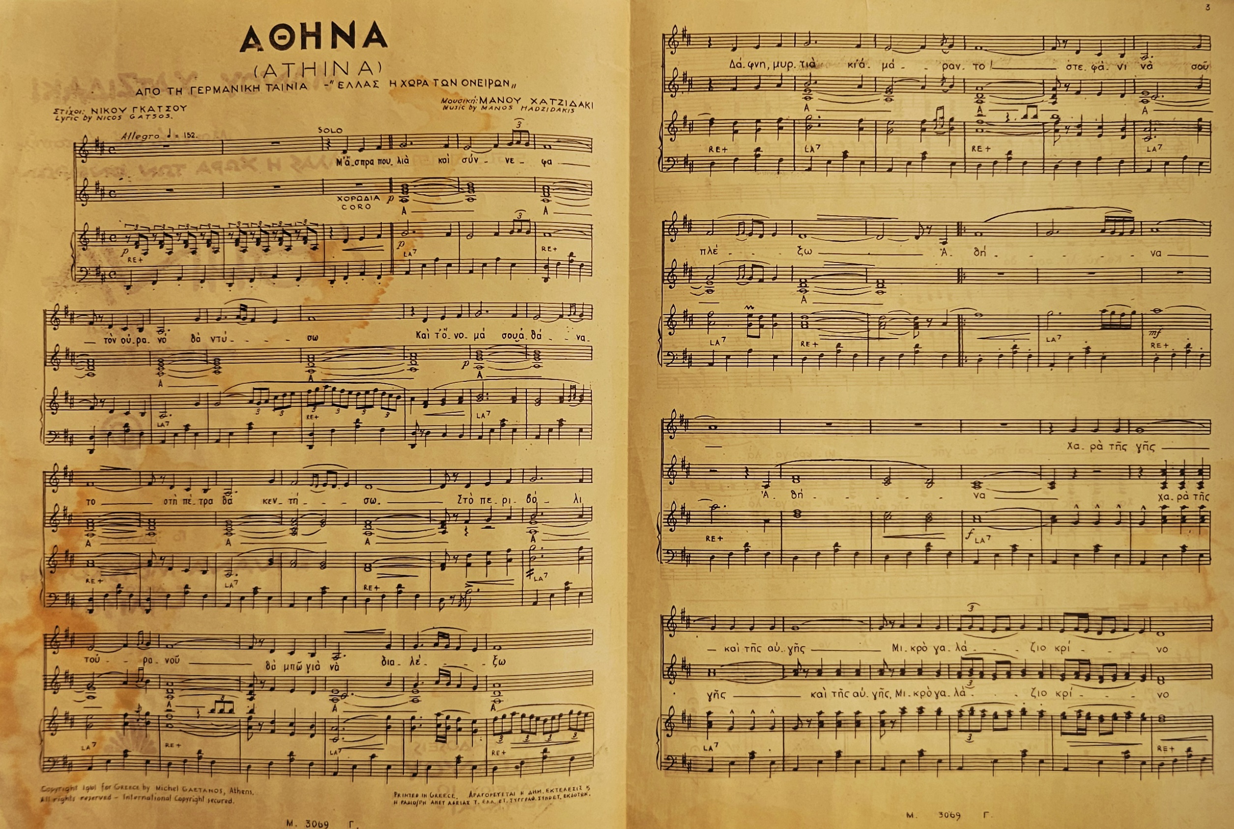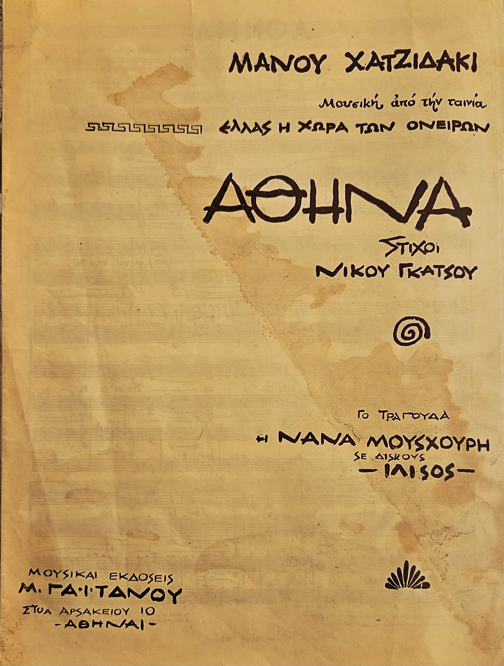 Original 1961 Greek sheet music for the song “Athina (Athina)”, composed by Manos Hadjidakis with lyrics by Nikos Gatsos, from the German film “Greece – The Land of Dreams”.