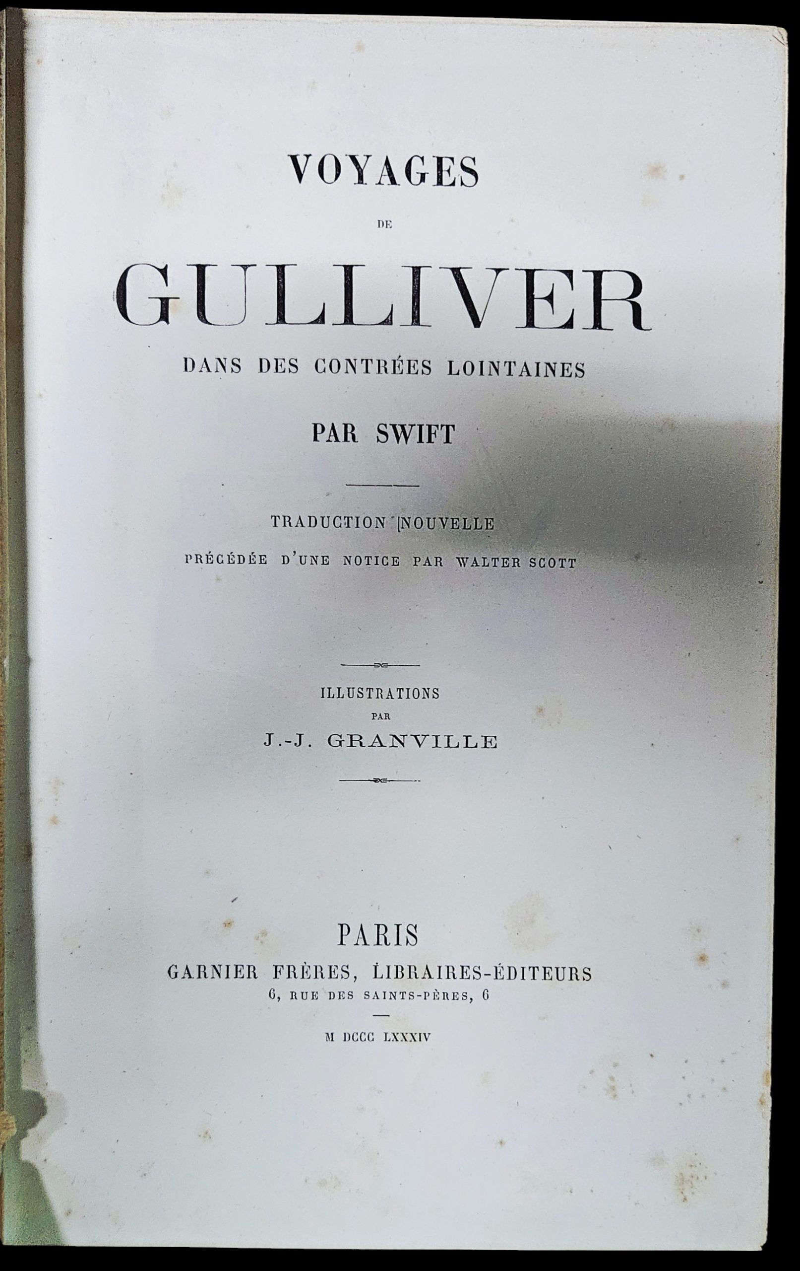 An original 1884 French illustrated edition of Voyages de Gulliver by Jonathan Swift, published in Paris by Garnier Frères, Libraires-Éditeurs. This 19th-century edition features numerous illustrations attributed to the renowned French artist J.-J. Grandville.
