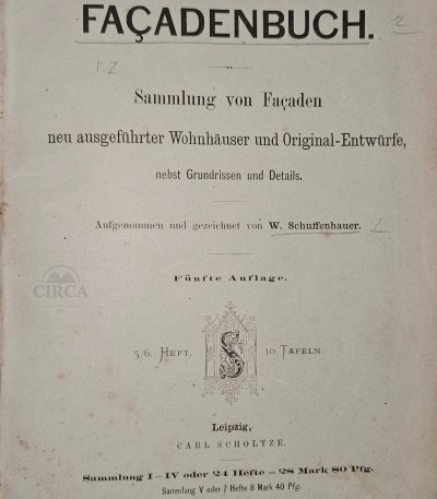 W. Schuffenhauer — Façadenbuch. Sammlung von Façaden neu ausgeführter Wohnhäuser und Original-Entwürfe, nebst Grundrissen und Details. Leipzig: Carl Scholtze, Fifth Edition [c. 1875]. (“Book of Façades. Collection of Newly Executed Residential Houses and Original Designs, with Floor Plans and Details.”)