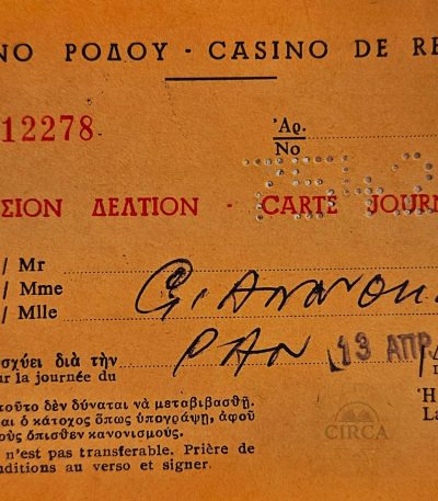 €35.00Αυθεντική κάρτα εισόδου (Ημερήσιον Δελτίον / Carte Journalière) του Καζίνο Ρόδου, με ημερομηνία 13 Απριλίου 1969. Το δελτίο είναι τυπωμένο δίγλωσσο (ελληνικά και γαλλικά), με χειρόγραφες σημειώσεις και αναφορά στην τιμή εισόδου (30 Δρχ.). Στο πίσω μέρος αναγράφονται οι κανονισμοί και οι όροι χρήσης.